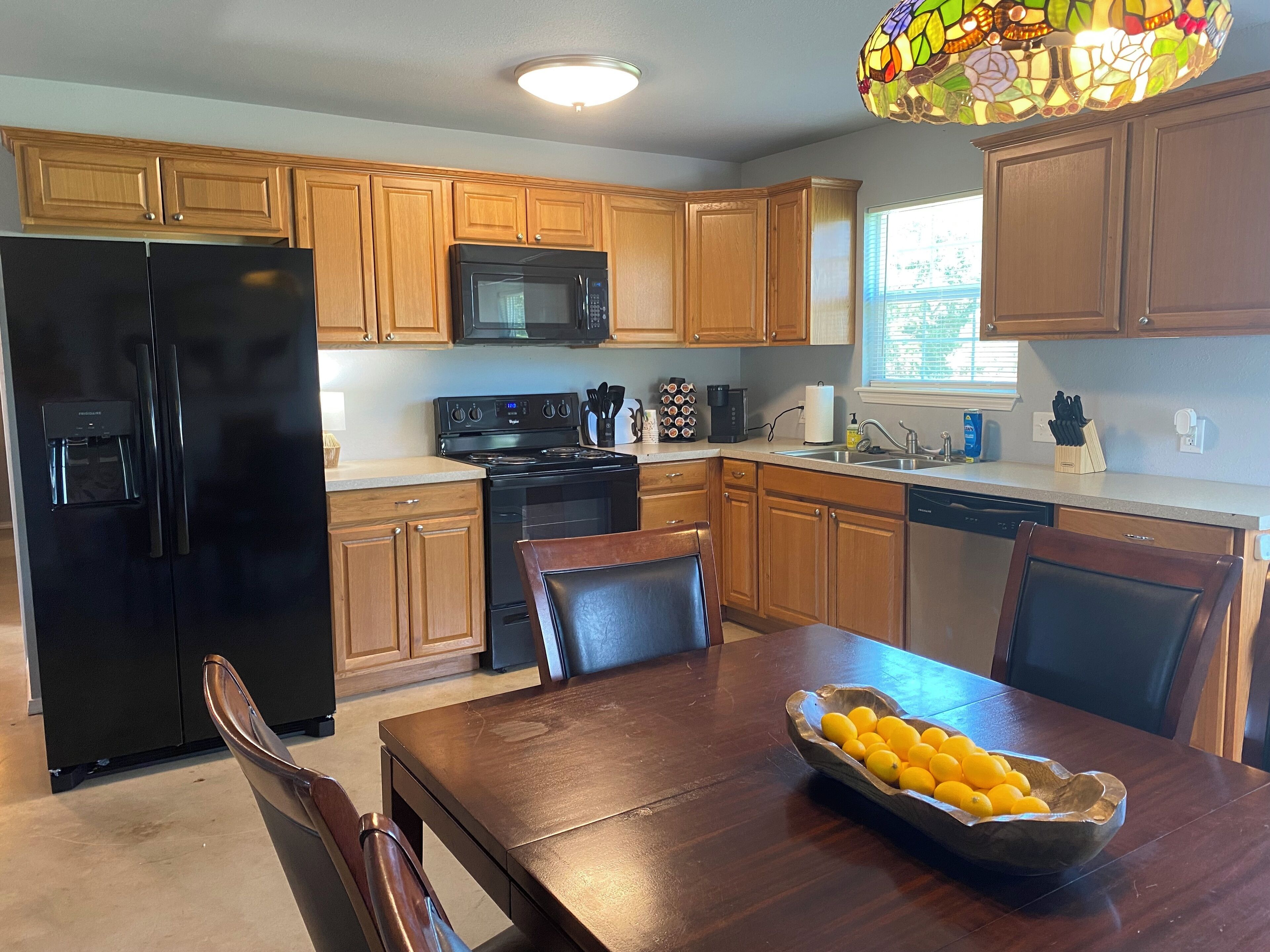 KITCHEN: Fridge, stove, oven, dishwasher, microwave, cooking basics, spices, blender, toaster, coffee maker, high chair, dishware/flatware, paper towels/trash bags