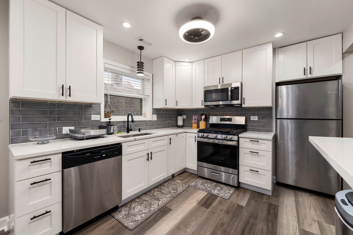 Peaceful, zen, and serene five minutes from Midway Airport! This is a newly completely renovated 3 bed 2 bath apartment, fully furnished with a full kitchen, and basement. You can enjoy the outdoor space during the warmer months and will have access to a washer/dryer during your stay.
