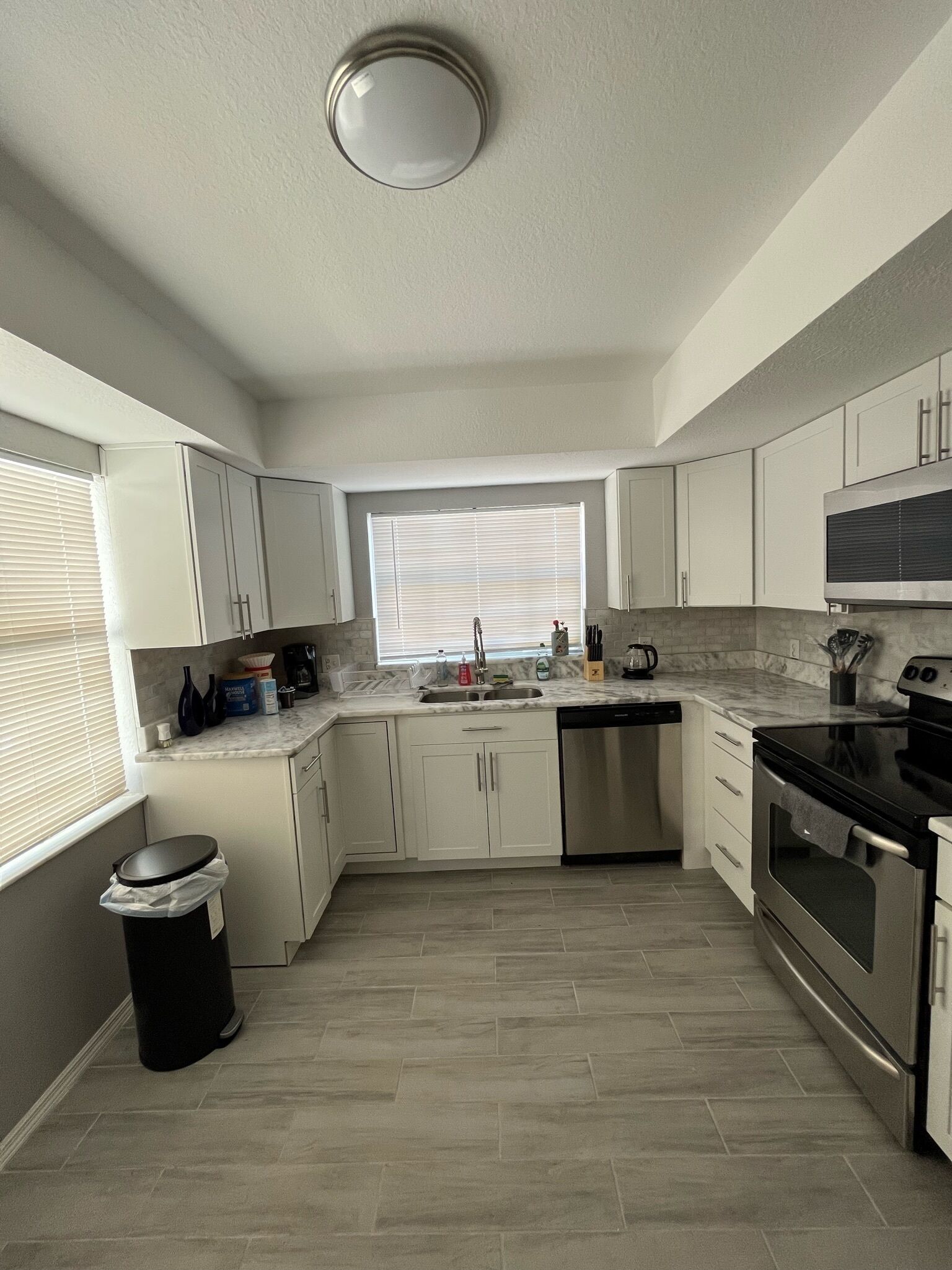 - Fully- equipped kitchen with a full-sized refrigerator, stovetop, microwave oven, oven, dishwasher, pots and pans, utensils, plates, and glasses, and ample counter space;