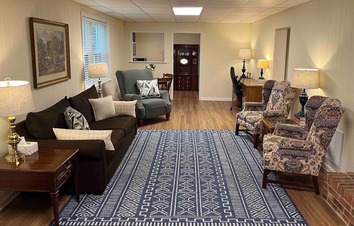 Welcome to the cozy yet spacious downstairs space in our 1970s fixer upper! Close enough to all that our beloved Clemson has to offer, but in a quiet neighborhood that has that “away from it all” vibe. You’ll love all the room to relax and spread out. Come and go using your own private entrance, and enjoy the covered patio or fire pit in our wooded backyard. Perfect for resting after a victory tailgate or a picturesque hike, come home to recharge and then set out on your next adventure!