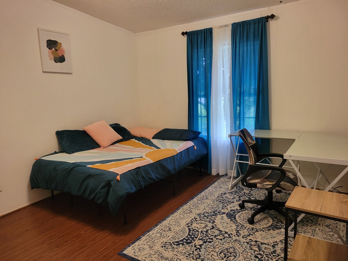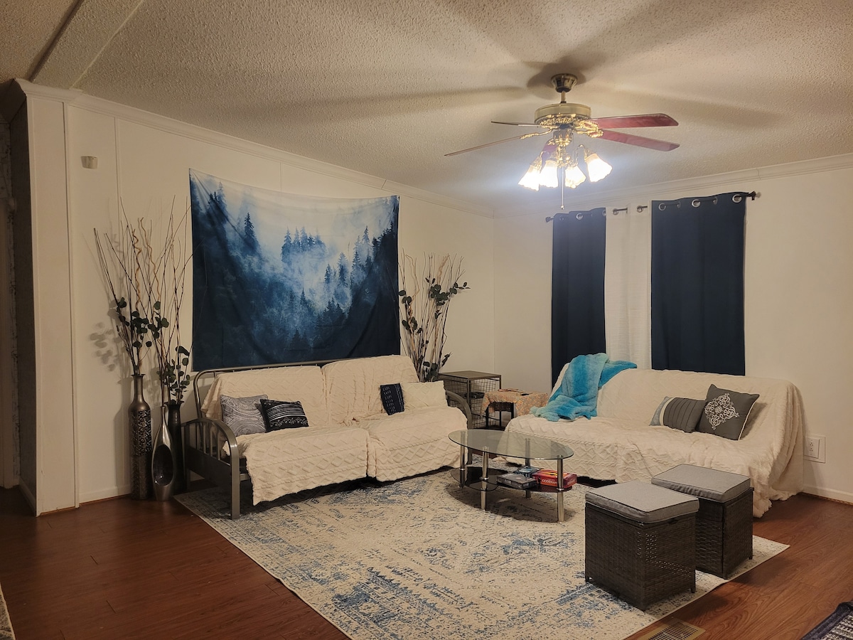 The Cozy Tiger provides multiple spots to relax, read a book, or enjoy a movie. The entire space of over 800 sq ft has been renovated and updated since Fall 2020. Our decor is an eclectic mix, but all very homey and comfortable. Besides the queen bed with mattress topper, there is a very comfortable futon (not your normal futon, we promise!) that would be suitable for one adult or 2 children, and a couch that would sleep one child.