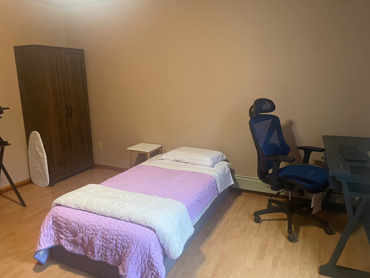 Male only (due to shared bathroom). A large private bedroom that features a dedicated workspace, 32 inch TV with Amazon Firestick, large closet, compact (and quite!) private fridge, a recliner chair. The room also has a curved bay with 4 large windows to enjoy the morning sunlight. The bathroom is shared and is conveniently located close to this bedroom. The room is located on the second floor of the house.