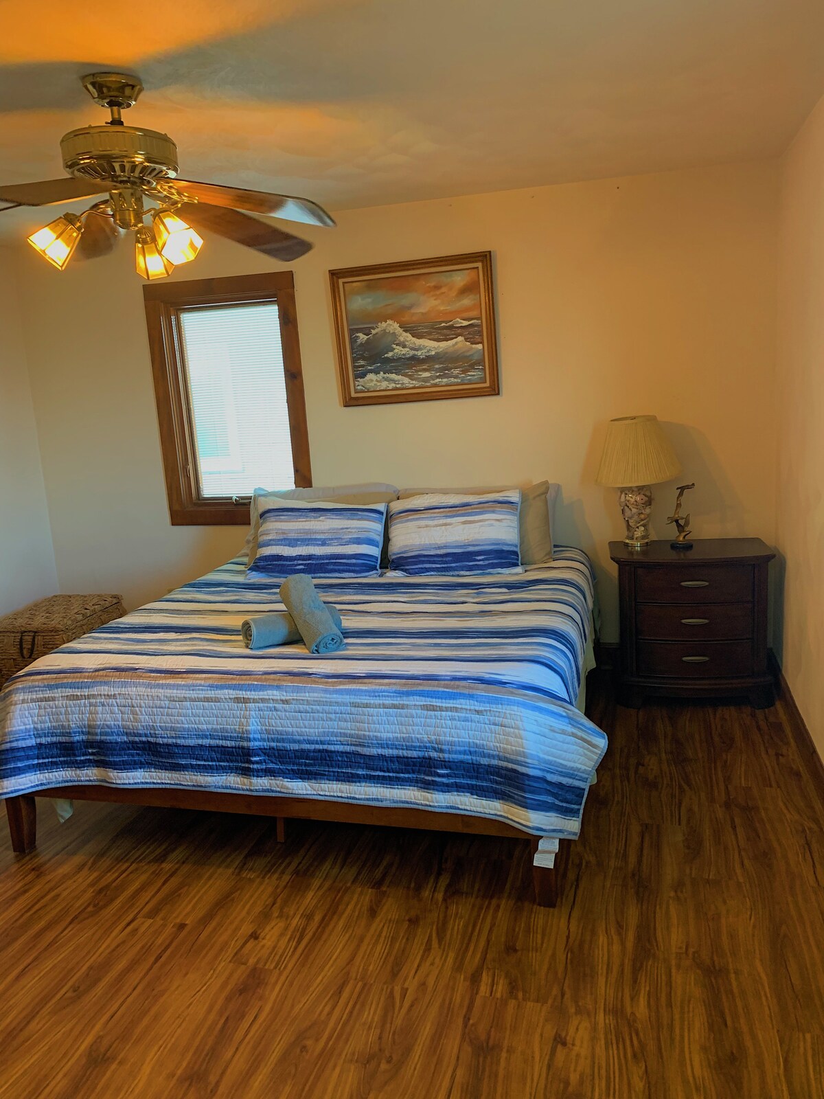 Enjoy the new renovated space with a King size bed; 55” wall mounted smart tv; Kitchenette which provides everything you need with a countertop toaster oven and Keurig!