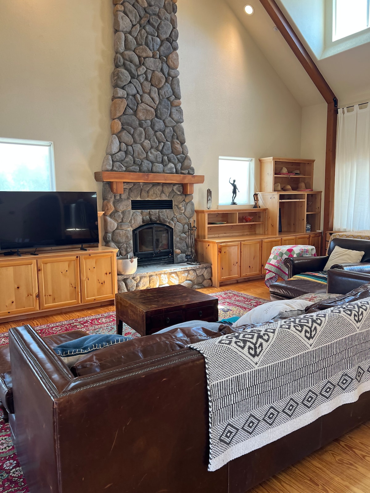 Living Area: The open-concept living room boasts tall ceilings, a stone fireplace, and large windows offering sweeping views of the surrounding farmland and mountains. A comfortable spot to unwind with family or friends.