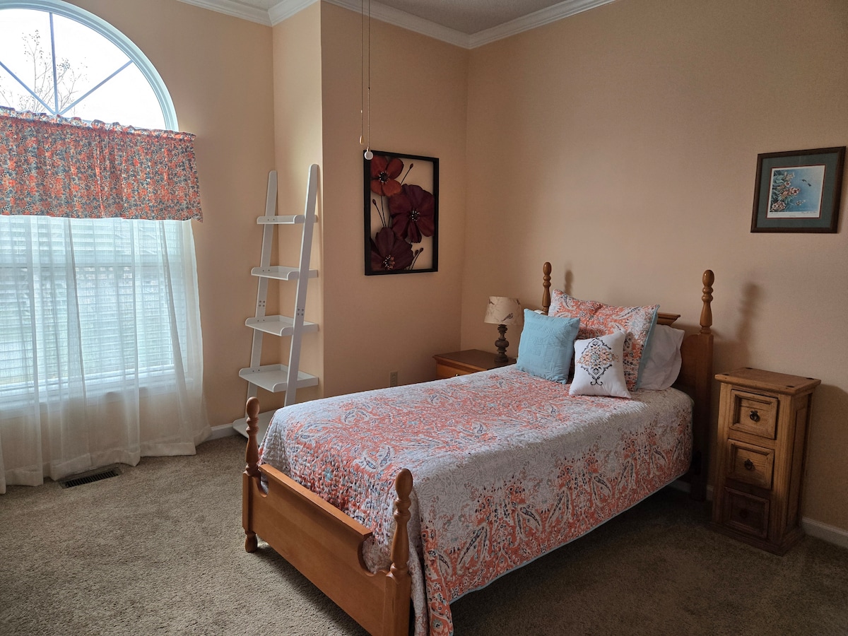 The space is very quiet and private. There is plenty of parking and guests enter through a private entrance off the sunporch, which is bright, sunny, and relaxing. Guests are welcome to sit in the sunroom and enjoy the views of the yard, mature trees, and occasionally deer. The private entrance leads straight to the guest bedroom and bath. The bedroom has a queen size bed with soft linens and plenty of pillows. The bedroom also has a closet (that includes hangers, an iron, and an ironing board) and a large dresser with empty drawers, if you'd like to unpack your bag during your stay. There is a microwave, mini fridge, and Keurig coffee maker in the room for your convenience, and there are snacks and bottled waters ready for you when you arrive. The bedroom includes free Wi-Fi access and includes a 32 inch flat screen tv with access to Netflix and Hulu. The private bathroom is next to the bedroom, with shampoo, conditioner, body wash, and a hair dryer included.