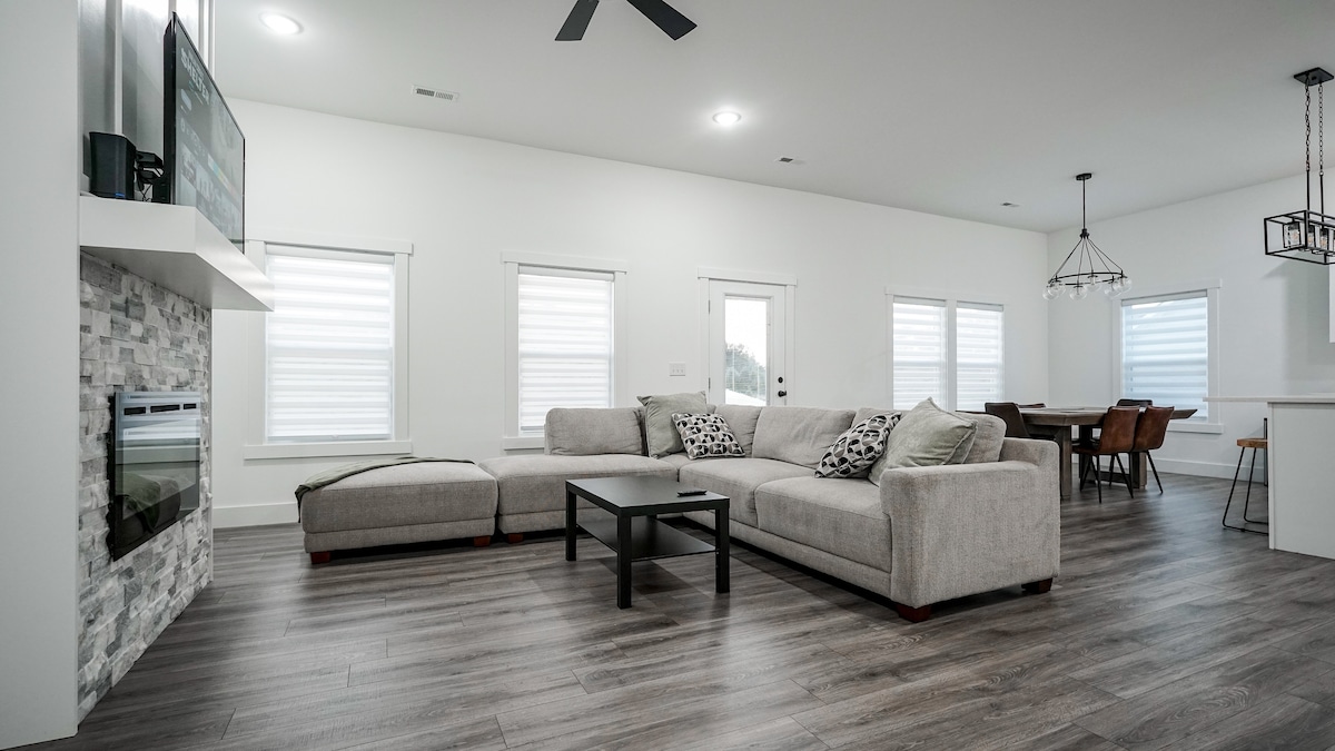 The spacious living and dining area includes a large sectional couch, providing ample seating for everyone.