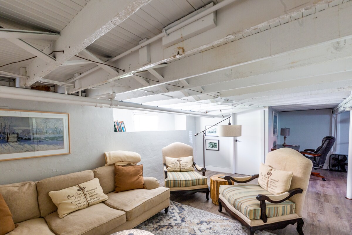 Inside, the basement provides additional living space with a Queen Bed, two dressers, a hanging rack, an office desk with a chair, and a comfortable living area complete with a couch, 2 oversized reading chairs with light, and a ROKU TV. The basement also features a shared laundry room equipped