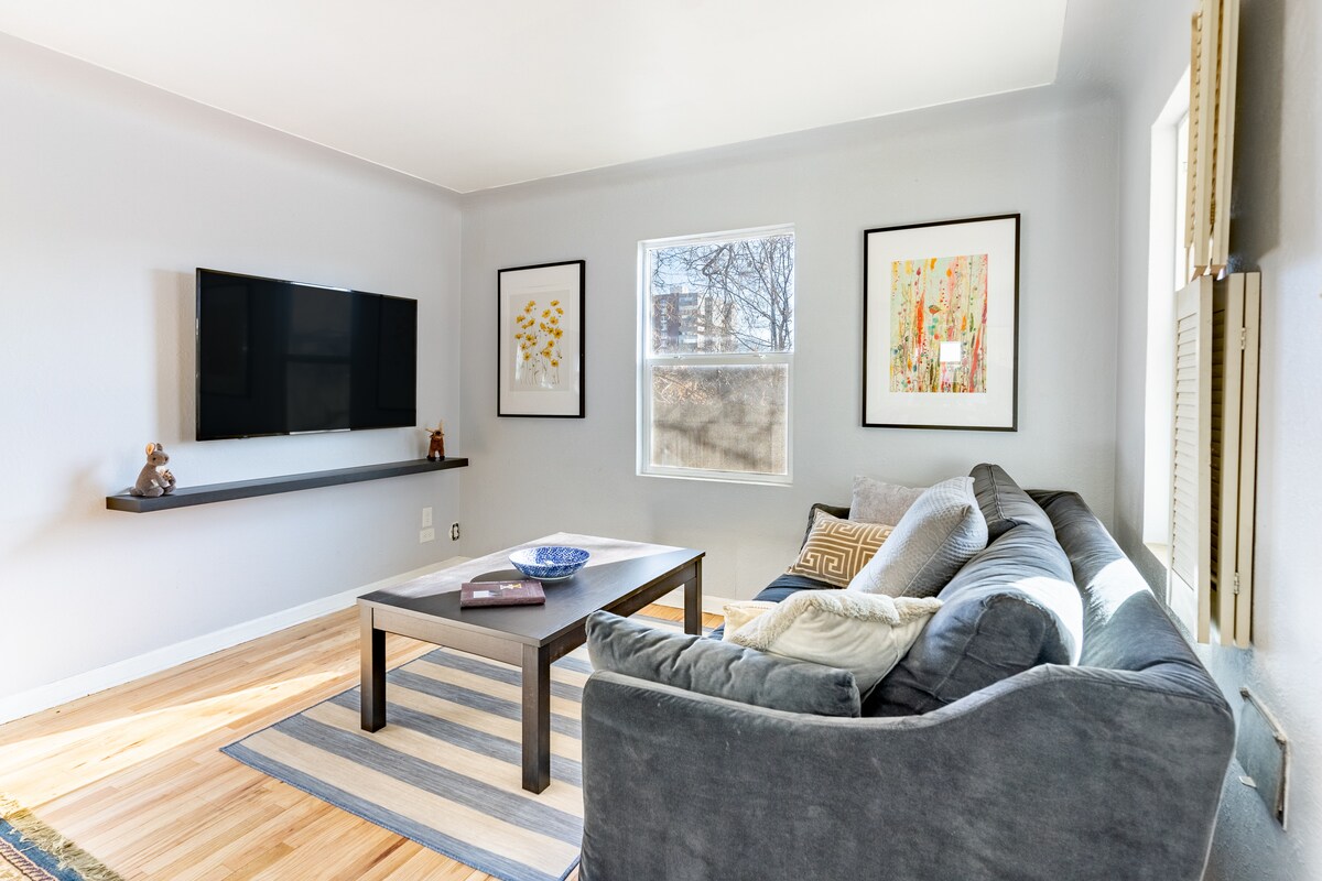 Enjoy a relaxing stay in this main floor 2 bedroom unit in completely remodeled Corey-Merrill house, conveniently located to all Denver has to offer. Includes kitchen with eating nook, living area, two bedrooms, and one bathroom. Unwind on the private back patio or by the warm gas fireplace in living area. Private off street parking spot included.