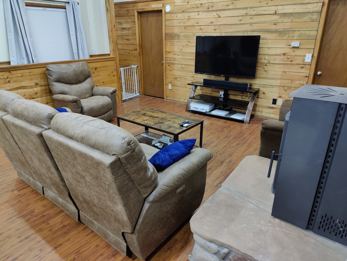 Keep warm during the winter time in front of the stone, wood burning fire place in the dining room, or snuggle up with a good book in the Living room. The Living room is also an ideal place to enjoy the killer views out the picture window, enjoy one of the nearly 200 movies/250 books/35 games we provide, stream your favorite shows on our 46" TV, or just relax in front of the gas fireplace (that's right, 2 fireplaces!).