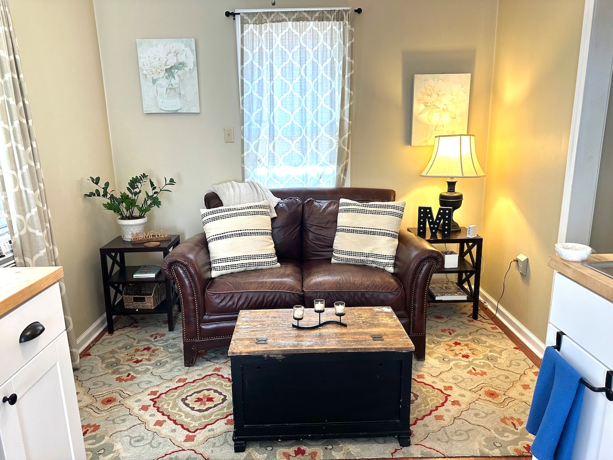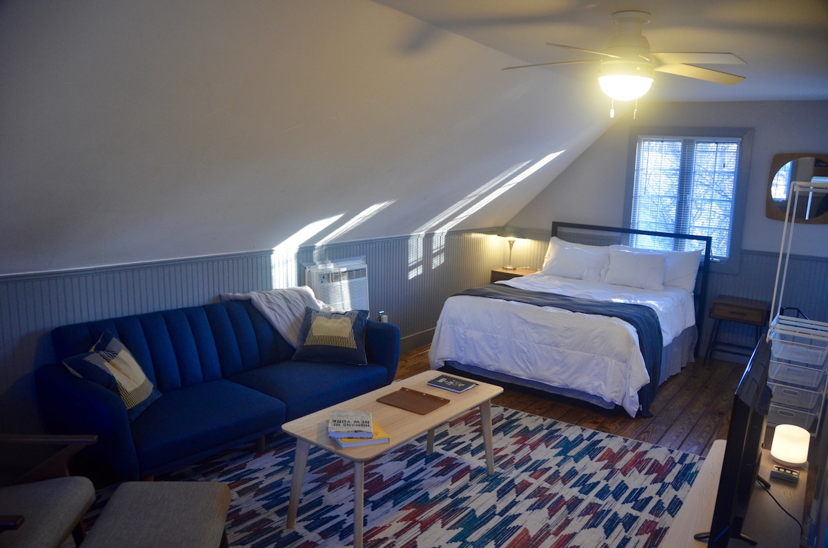 The kitchen is fully stocked, we supply a Keurig coffee maker and coffees...there are pots and pans, dishes and utensils. Range, dishwasher, refrigerator and microwave are supplied. You’ll find cold bottled water in the refrigerator. The space is designed with your comfort in mind, area rugs are padded, soft linens, towels abundant and freshly laundered. The bathroom has great lighting, a dispenser for liquid soap, shampoo and conditioner on the wall of the shower, a make up mirror and a wall hung blow dryer are there for your convenience. The front porch is yours to use as well, with bench seating and upholstered chairs.