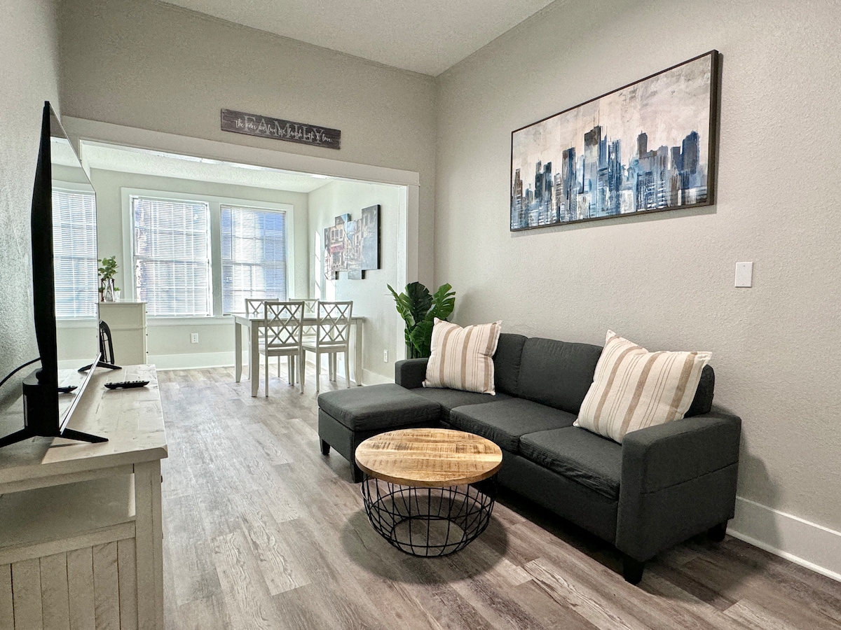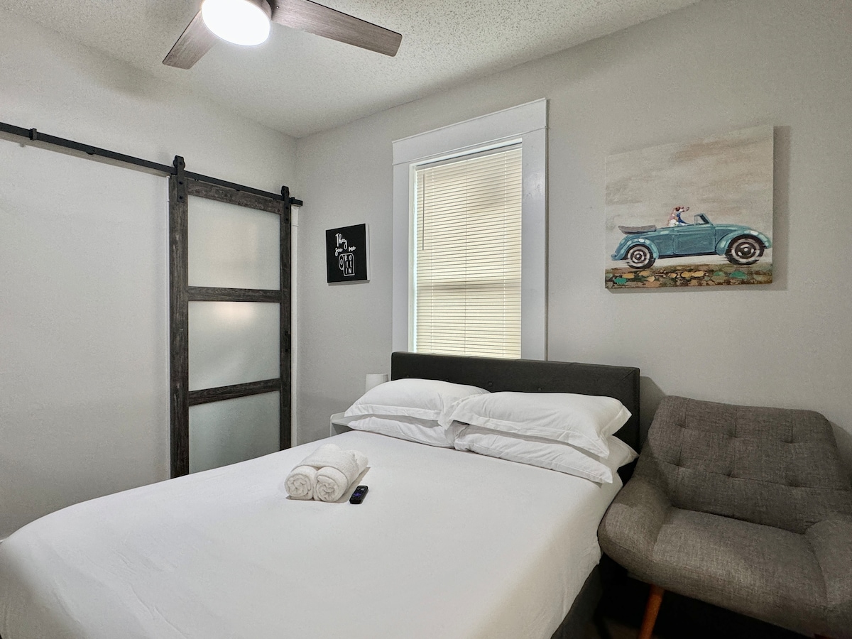 Mornings start with coffee on your private balcony—laptop open, high-speed Wi-Fi humming—before you swap screens for city adventures. Evenings unfold around the fire pit on the shared patio or curled up with board games, books, and your favorite show on Roku/Smart TV.