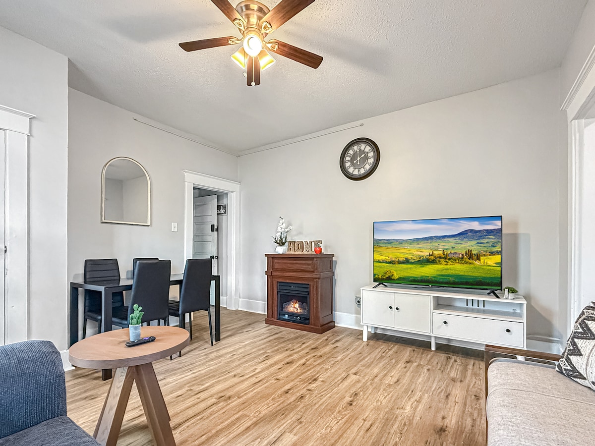 Guests have full private access to the upstairs apartment, including a sunny balcony off the living room—your own nook for coffee, conversation, or quiet exhale. The shared back patio, accessible via the kitchen stairway, includes a grill, fire pit, hammock, and an assortment of seating for communal unwinding. The in-unit laundry, discreetly located just off the kitchen, is a secure and private space for your use. Free street parking is available on North McNeil Street.