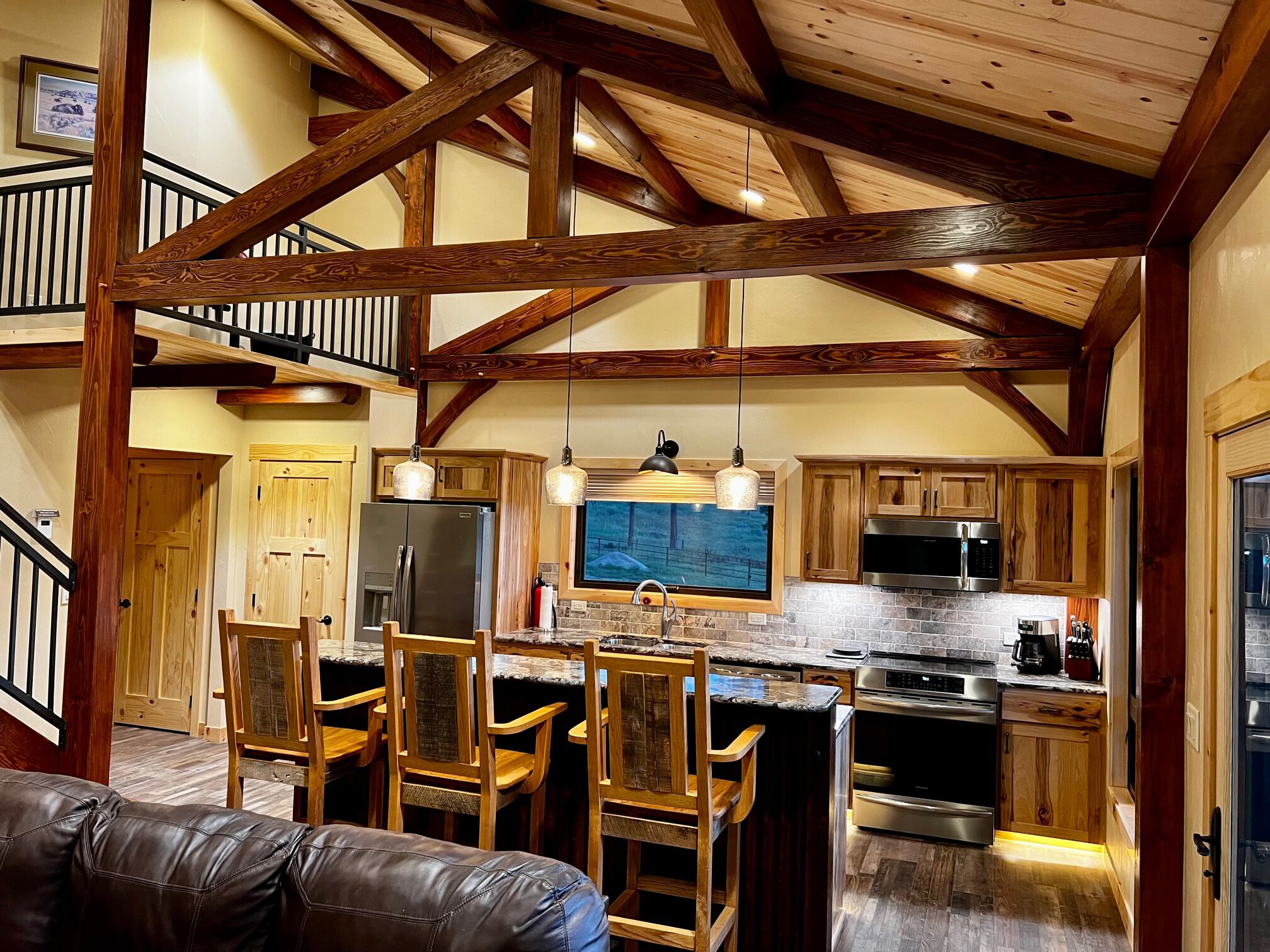 Step inside to experience rustic comforts and modern entertainment amenities. Stay connected with Wi-Fi, relax in the inviting living room on a comfortable sofa couch, and unwind in front of the TV. Plus, enjoy some fun with the arcade game in the cabin.