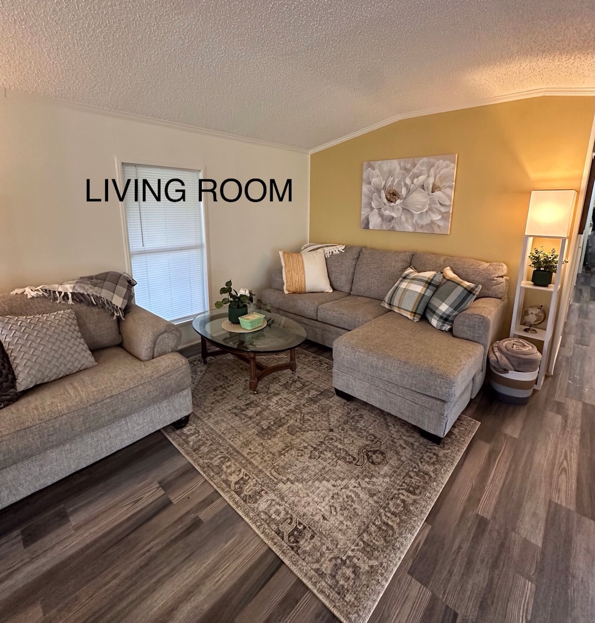 The living room is equipped with electric fireplace, wraparound plush couch and additional seating. A large smart TV is mounted above the fireplace. Off the living room is a small arcade/game room to enjoy at your leisure.