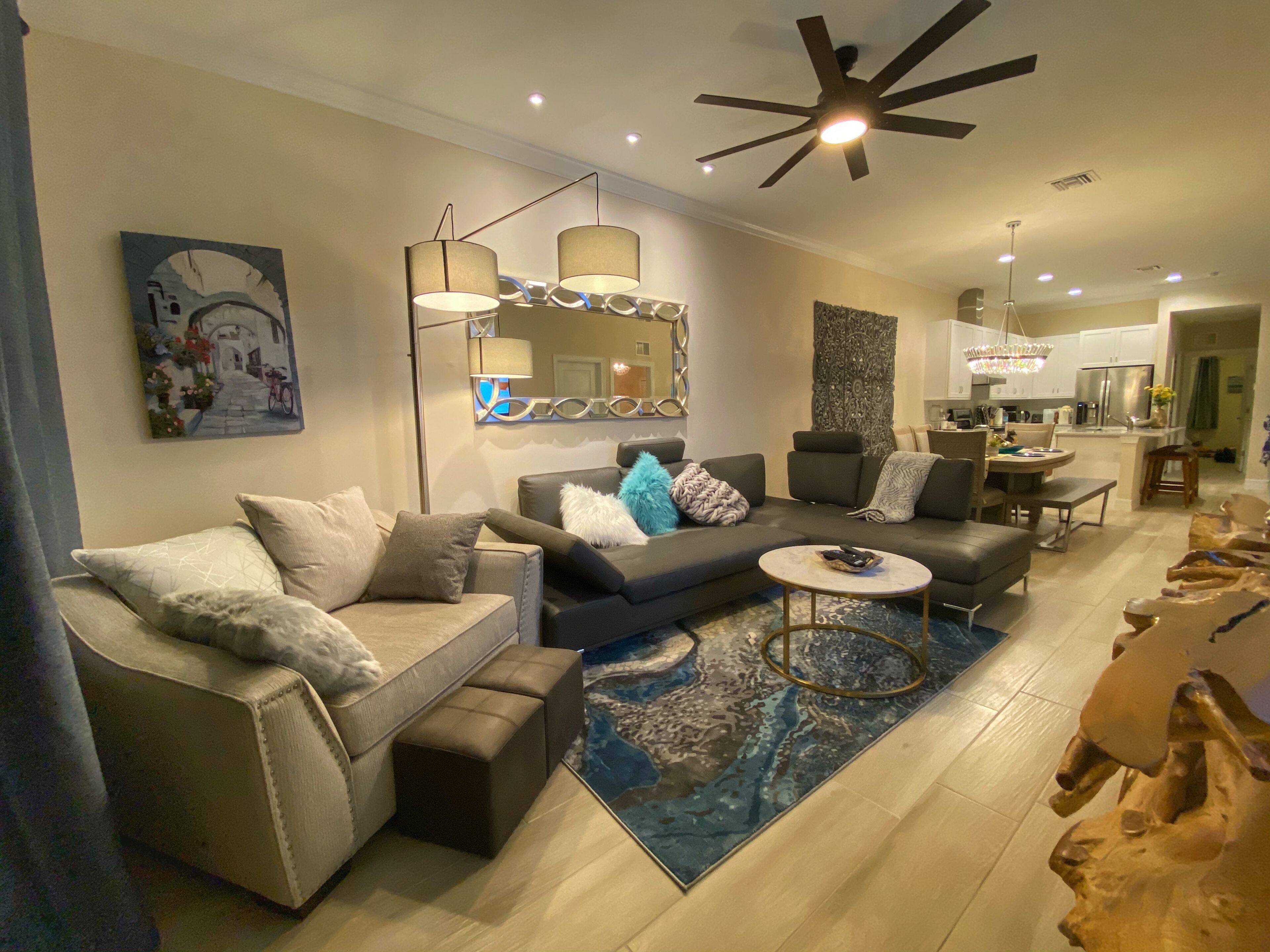 TOWNHOME HIGHLIGHTS: Smart TVs, dining table, ceiling fans, vaulted ceiling, electric reclining couches, adjustable beds, private hot tub, patio furniture