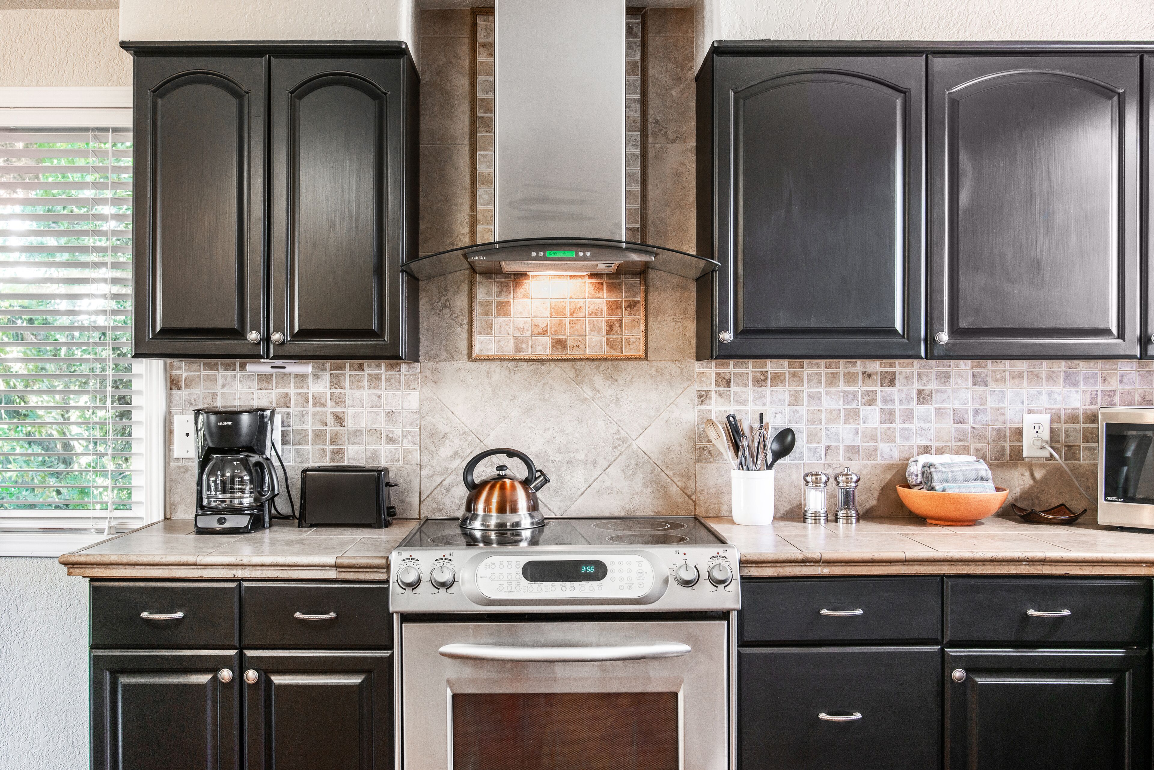 Inside, you'll find a welcoming living space with a full kitchen, complete with a center island and barstools. The kitchen is fully equipped for all your cooking needs, including outdoor cooking tools. A stocked coffee and tea bar awaits you, featuring a Nespresso machine and an automatic drip coffee maker.