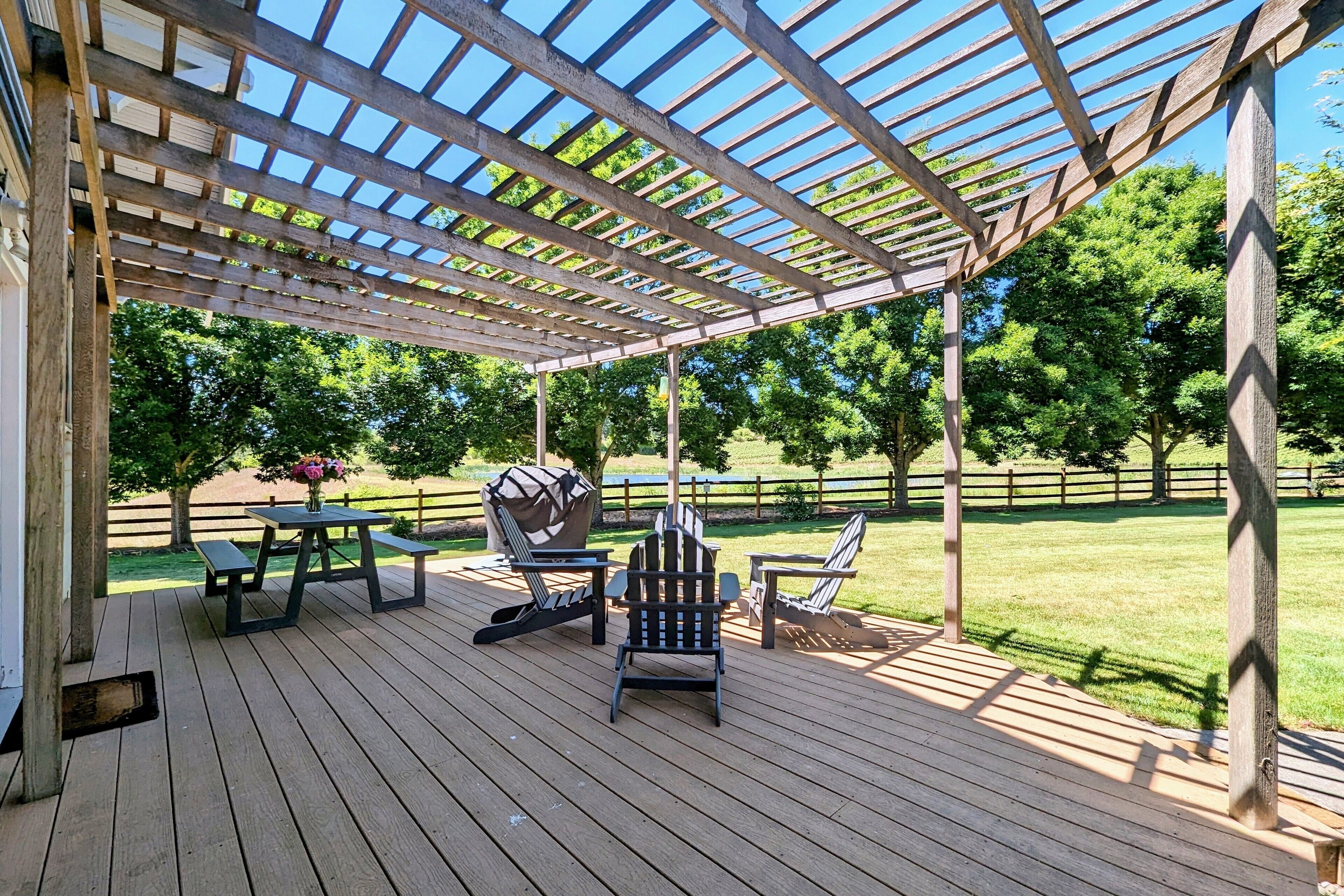 Your own private access is through the back door of the rental next to your own patio. There are 2.5 acres of quiet yard to enjoy, or watch the sunset while relaxing with a glass of wine.
