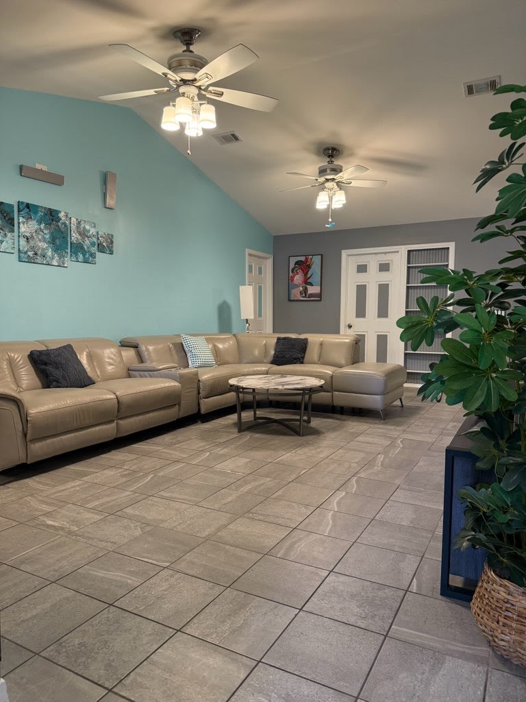 The Living Room is spacious and inviting, featuring a large sectional sofa and a 70-inch TV—perfect for movie nights or relaxation after a long day of exploring.