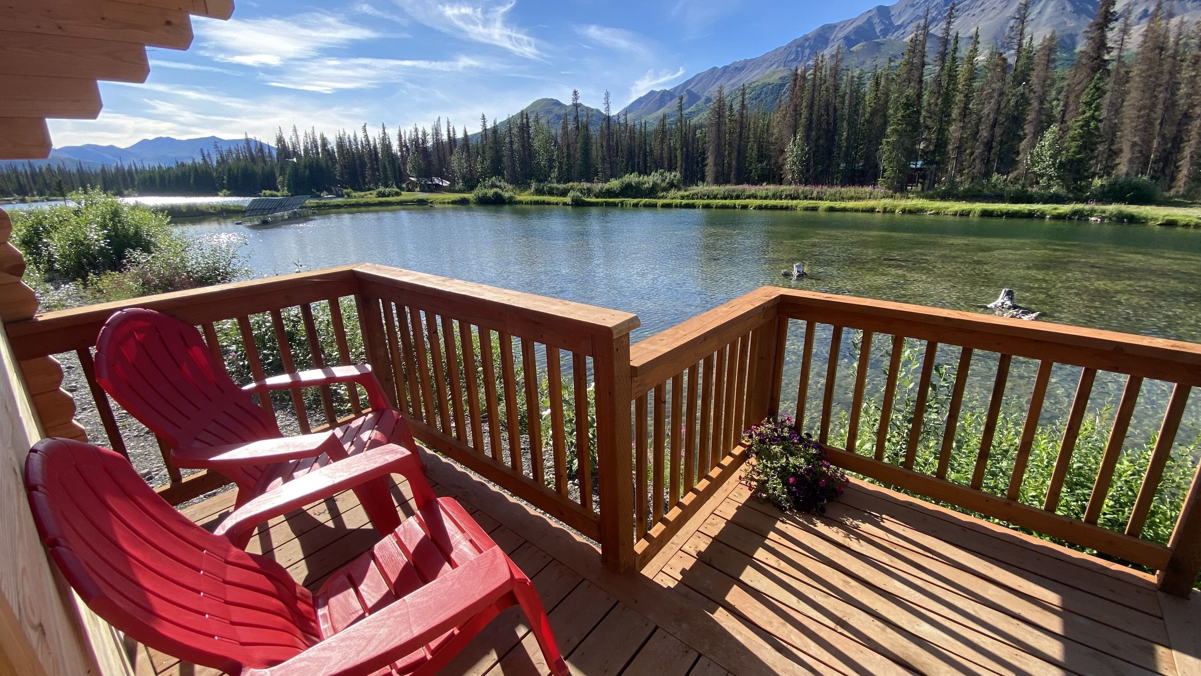 Personal outdoor deck with chairs & furniture for four overlooking the beautiful Nenana River.