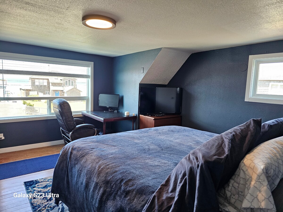 Full kitchen with ocean views from the living room, kitchen and bedroom. 55 in smart TV Roku ready for you to login to your favorite apps. Hulu live TV provided. The bedroom is upstairs accessed by 13 steps. Get your best nights' rest on a California King Beautyrest hybrid mattress on an adjustable frame. The bathroom, kitchen, and living room are on the main floor which is accessed by 12 outdoor steps. Work station provided. Unit is 716 sq ft. Discounts for 31+ night stays.