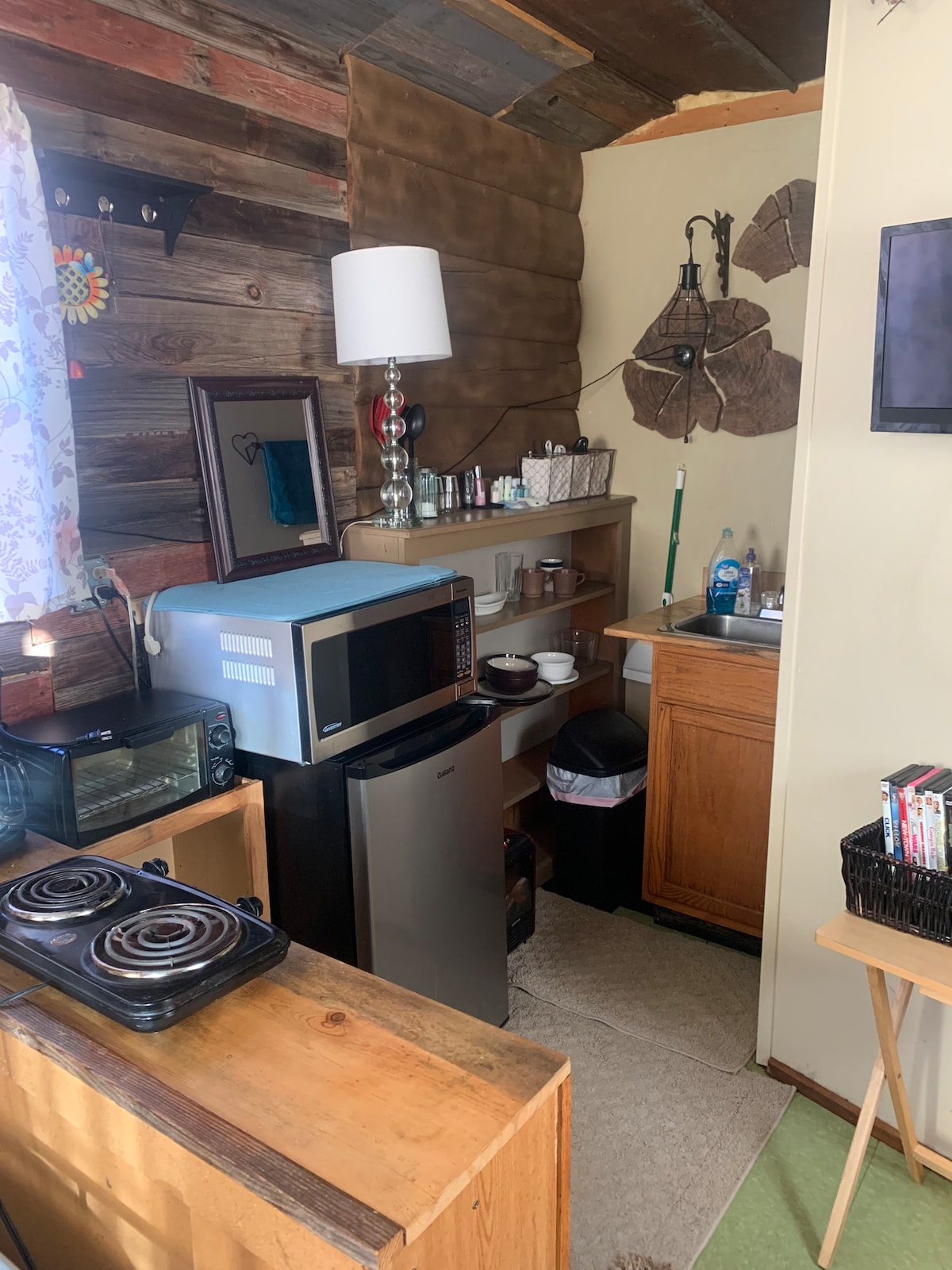There is a bathroom with shower, sink, and toilet; kitchenette with fridge, sink, microwave, and coffeemaker; and outdoor deck with gas grill. It has a wall A/C heating unit.