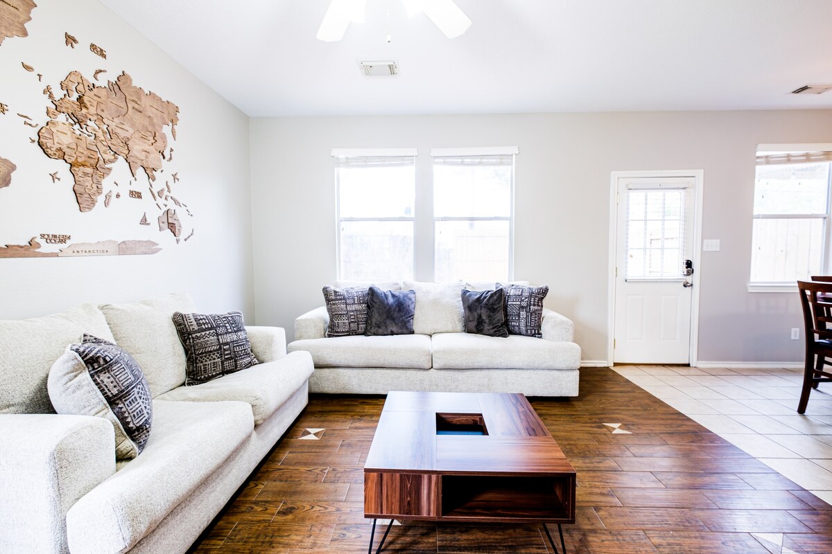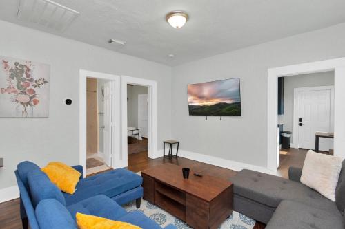 • Cozy sitting area with a 55” UHD TV, West Elm sofa, and West Elm lift-top desk coffee table — perfect for dining, board games, or working.