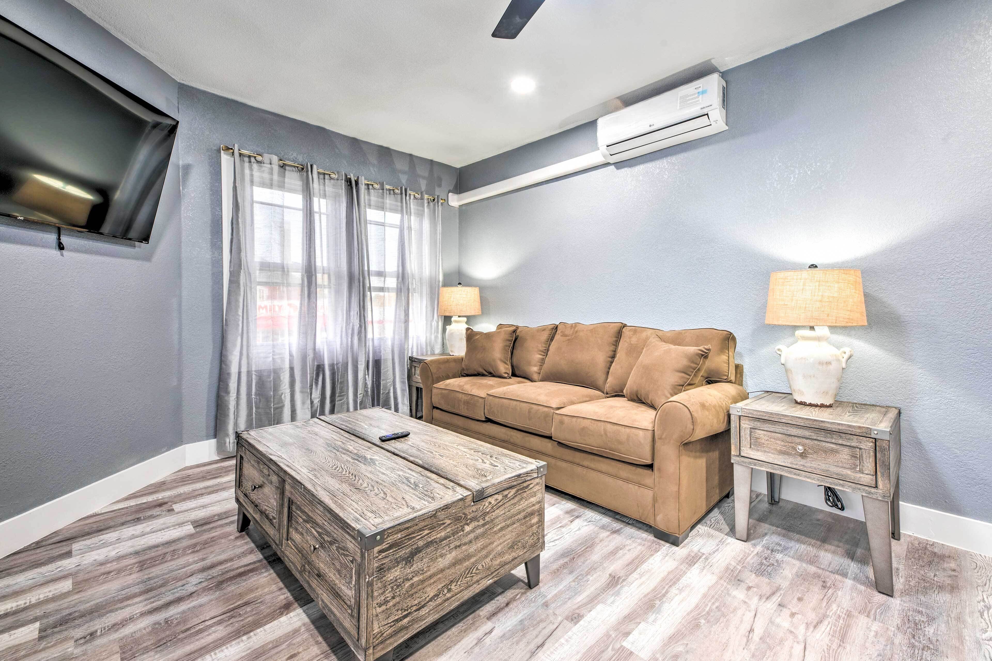 Relax in the living room with a 55-inch smart TV above the charming fireplace, or sink into the super-comfy Lovesac couch after a day of exploring the city. The kitchen is fully equipped with new appliances, ready for you to whip up a home-cooked meal to enjoy in the dining room or kitchen.