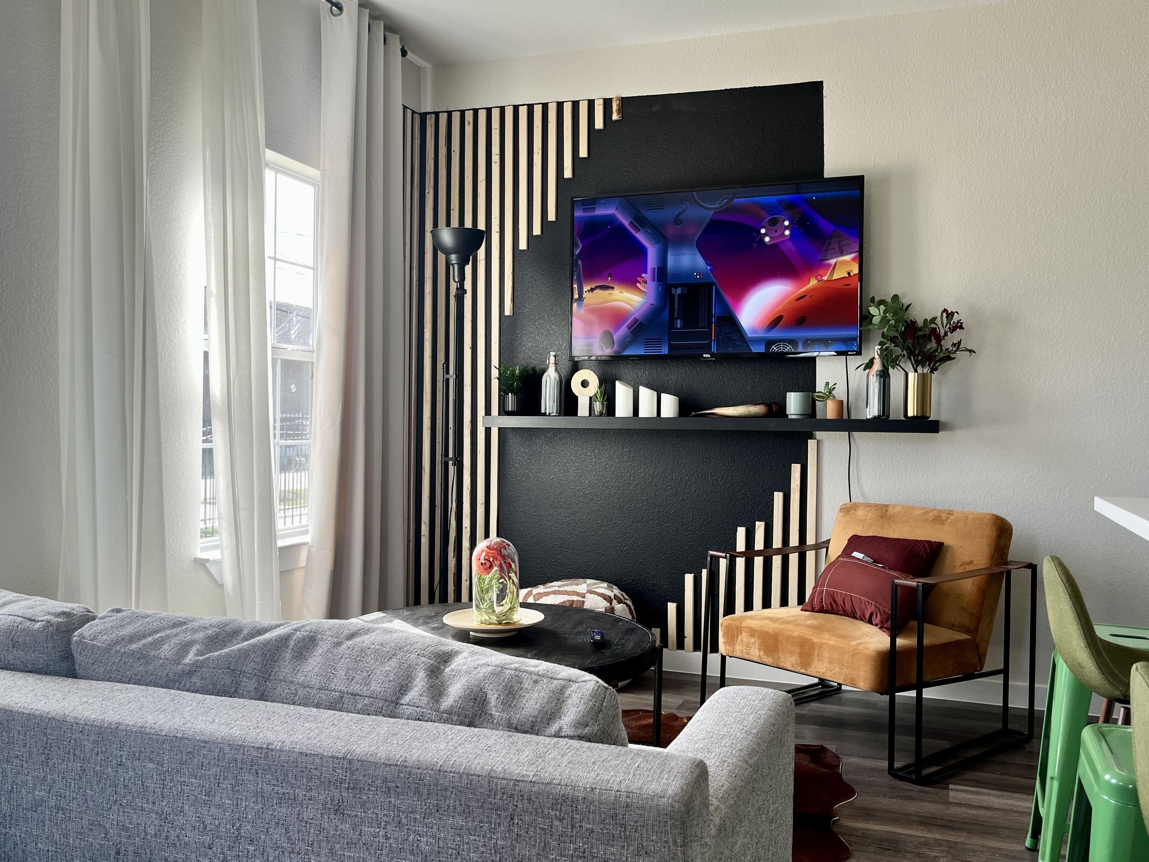 Guests have access to reserved room, kitchen, backyard, 1.5 bathrooms, and loft area with desk, couch, and tv. High speed wifi available. TV located in this room.