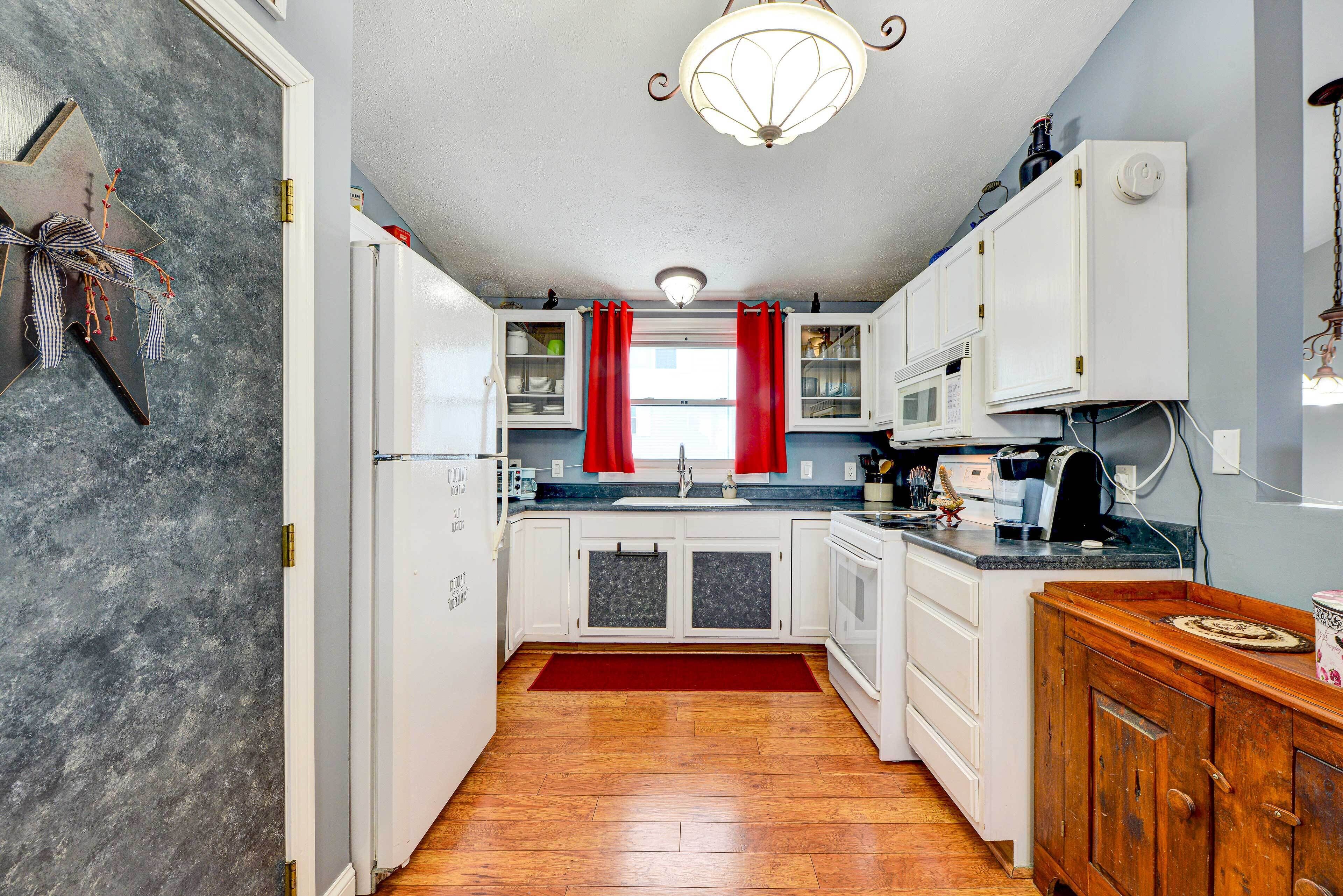Our kitchenette is equipped with all the fixin, including a two-burner electric stove, full-size microwave, mini-fridge, and Keurig coffee maker.