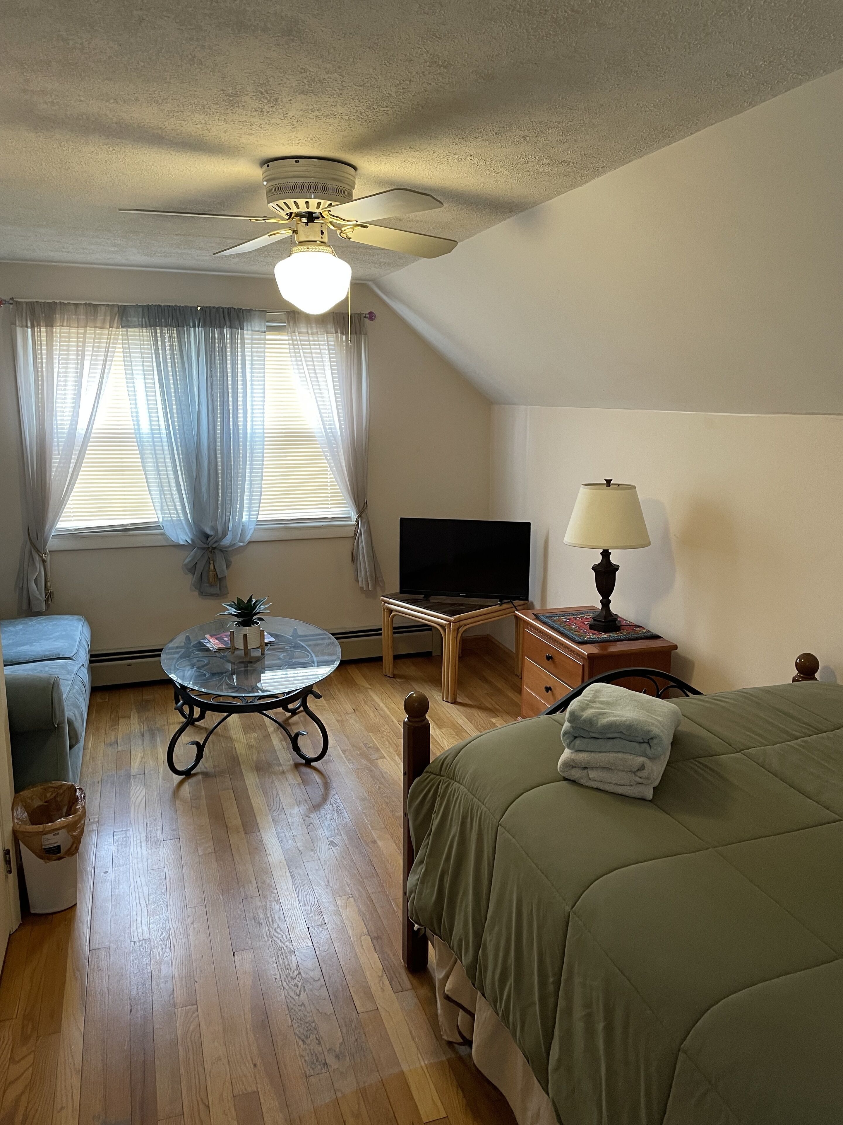This is a private bedroom in a shared 4-bedroom condo, one of 2 separate condos in this historic Victorian home. Though the house was built in 1910, it's equipped with super fast WiFi and shared 65" smart TV in the living room. Laundry is located in the basement at no additional cost (just bring your own detergent!) The kitchen and dining rooms have ceiling fans, but none of the common areas are air conditioned. We love our beautiful, historic home, but it's old. Expect to find sticky doors and squeaky floors!