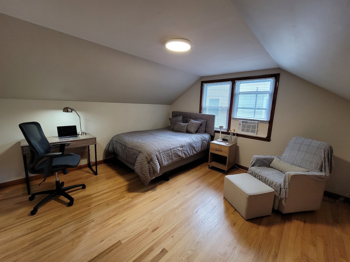 Beautiful big room with a queen sized bed, chair, computer desk, nice view for the backyard. Private access from inside to the backyard .