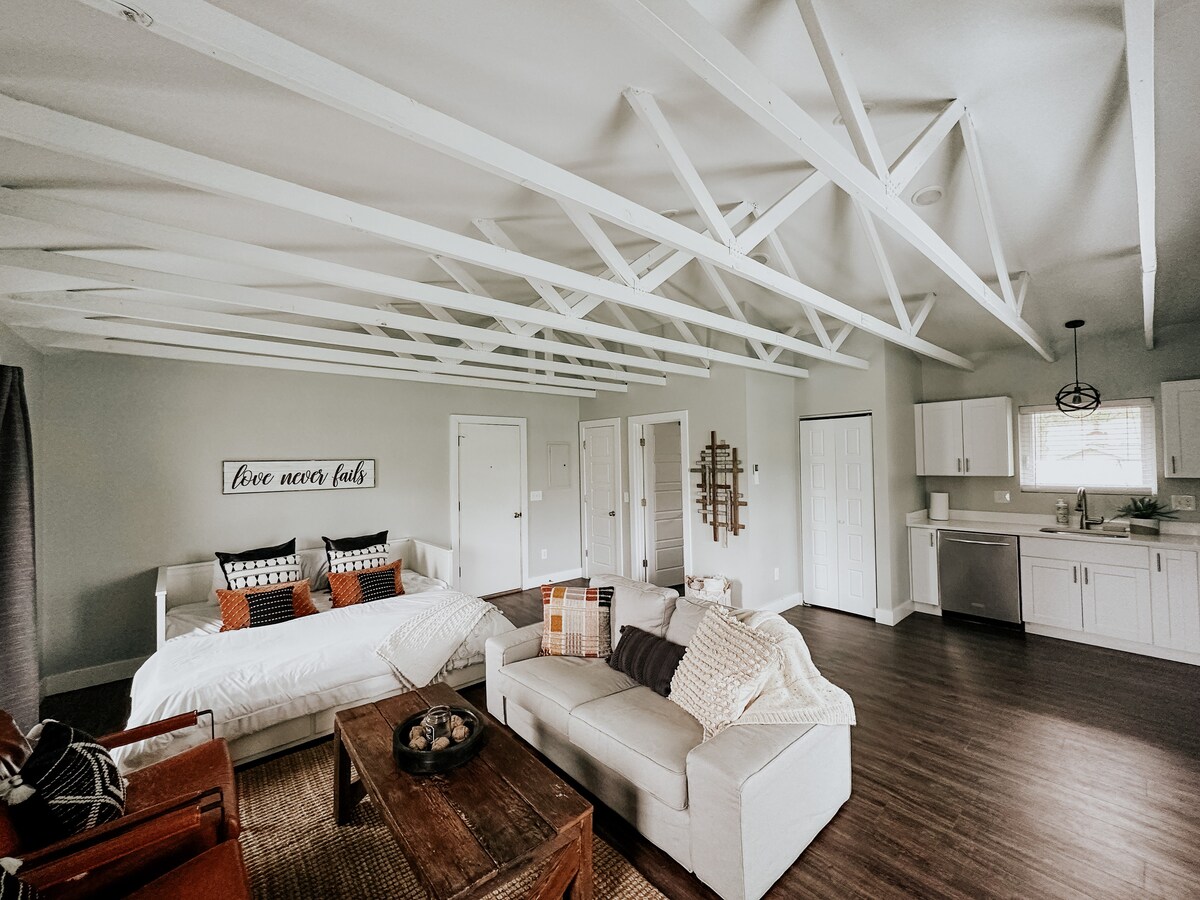 The studio apartment was built in 2018 and has all the amenities, including a full kitchen and bath, as you prepare to enjoy a day of fun or to unwind after a full day of walking around the festival. You are welcome to enjoy the property's pool, hot tub, firepit, and patio.
