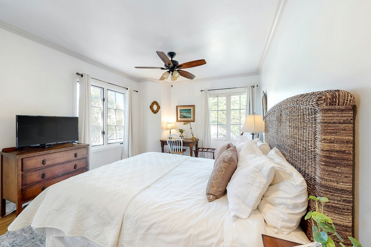 Located amid an intimate collection of exclusive vacation rentals, the 445-square-foot Santa Rosa suite is in a semi-private wing on the second floor of the historic Hitchcock House. Stroll just one block to the famed East Beach. Or, ride bikes to downtown and Sterns Wharf.