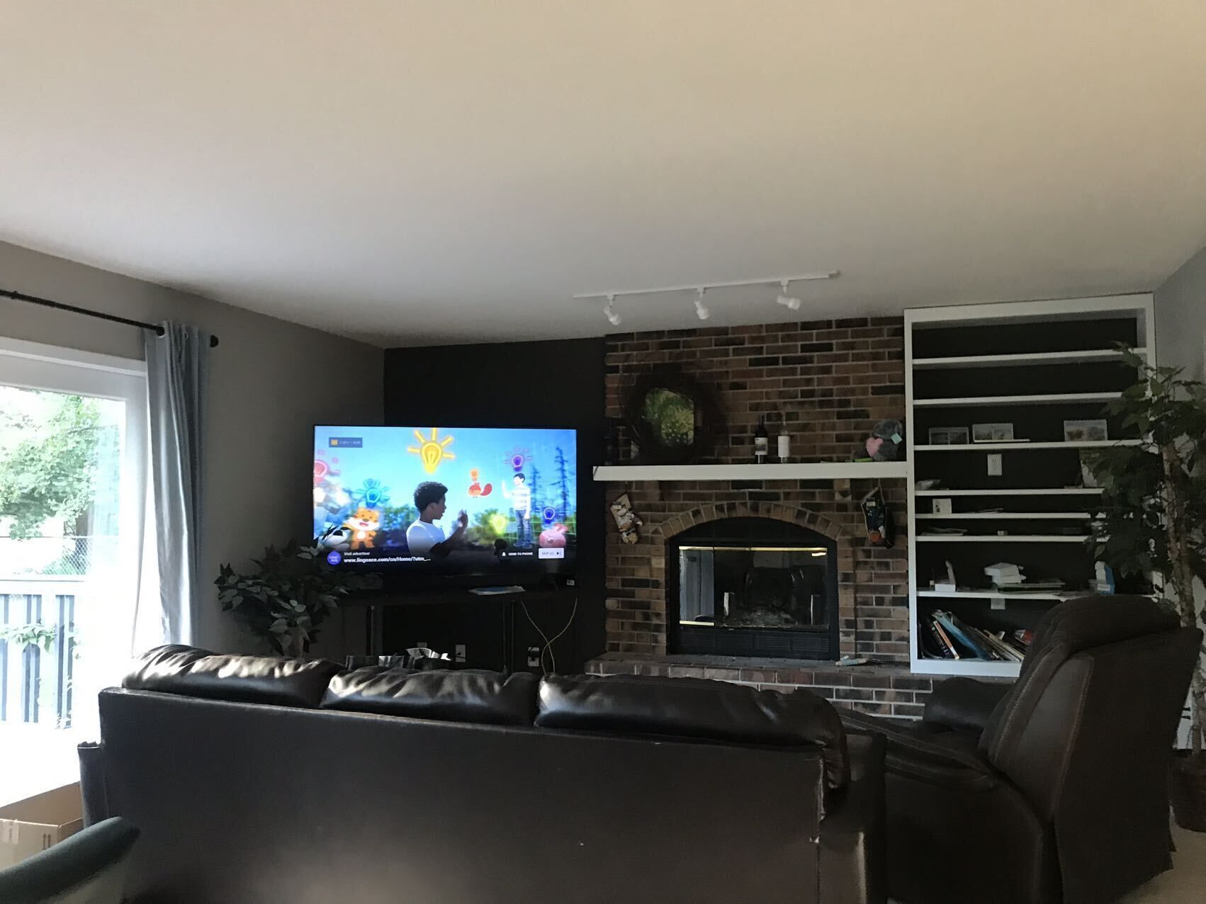 Basement is equipped with floor sofa and tv
