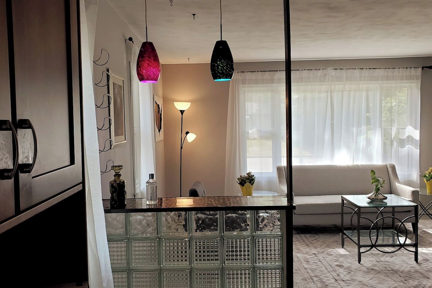 This is a mother in law apartment in the lower level of my house. Bright and colorful. Fun feeling of the mid 60s.