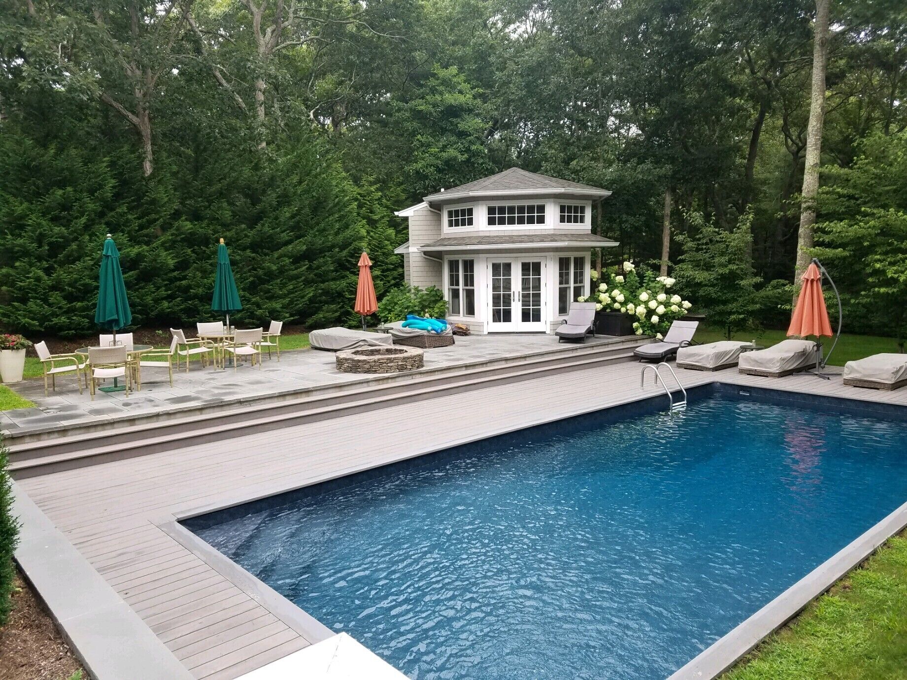 46ft pool with bench seating in the pool, large gas firepit, lounges and umbrellas (separate charge for propane used to heat up the pool)