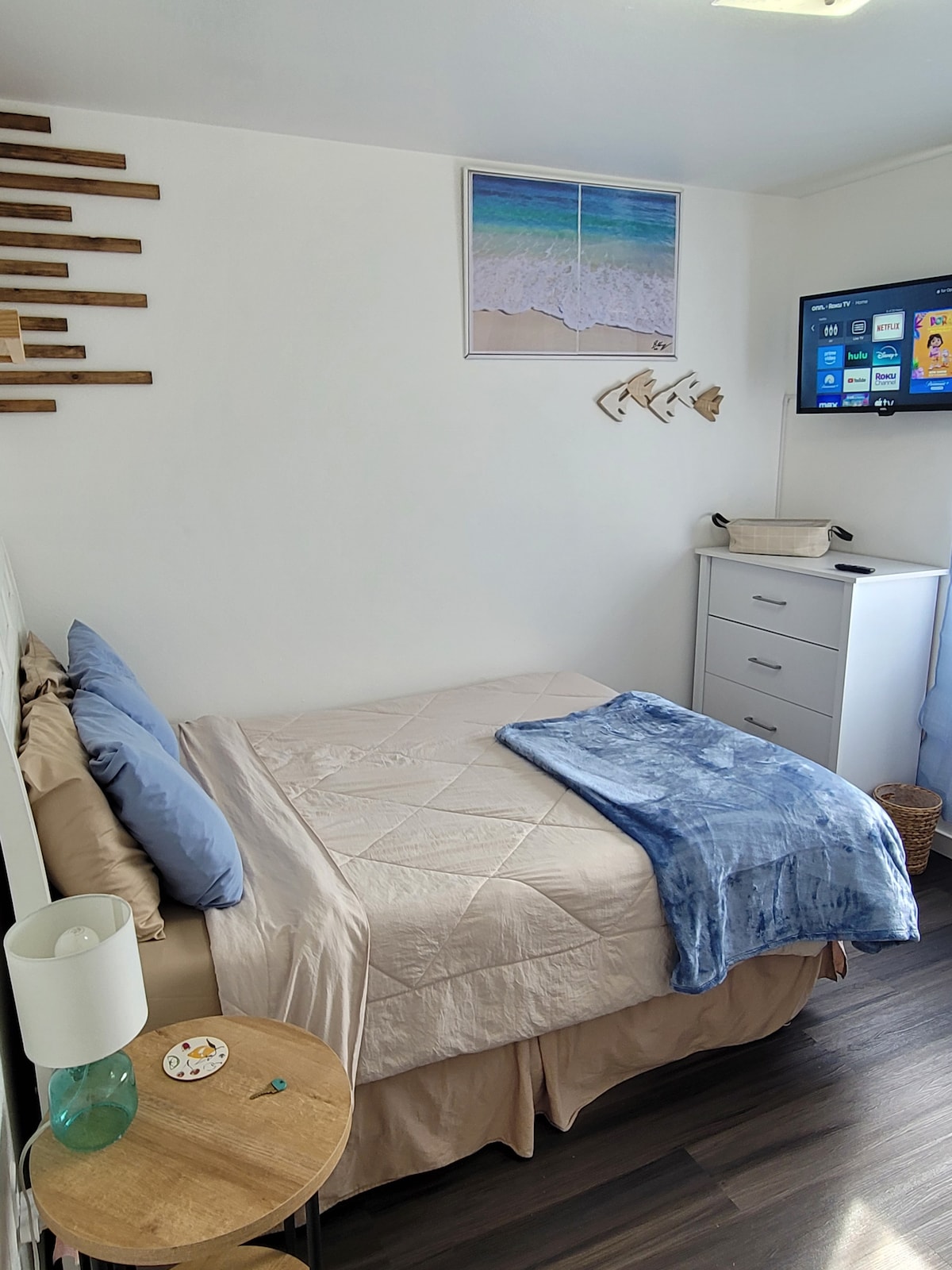 This room also includes a large TV, comfortable couch, a designated working/crafts station and board games, + bathroom with a tub/shower combo, sink, and mirror.