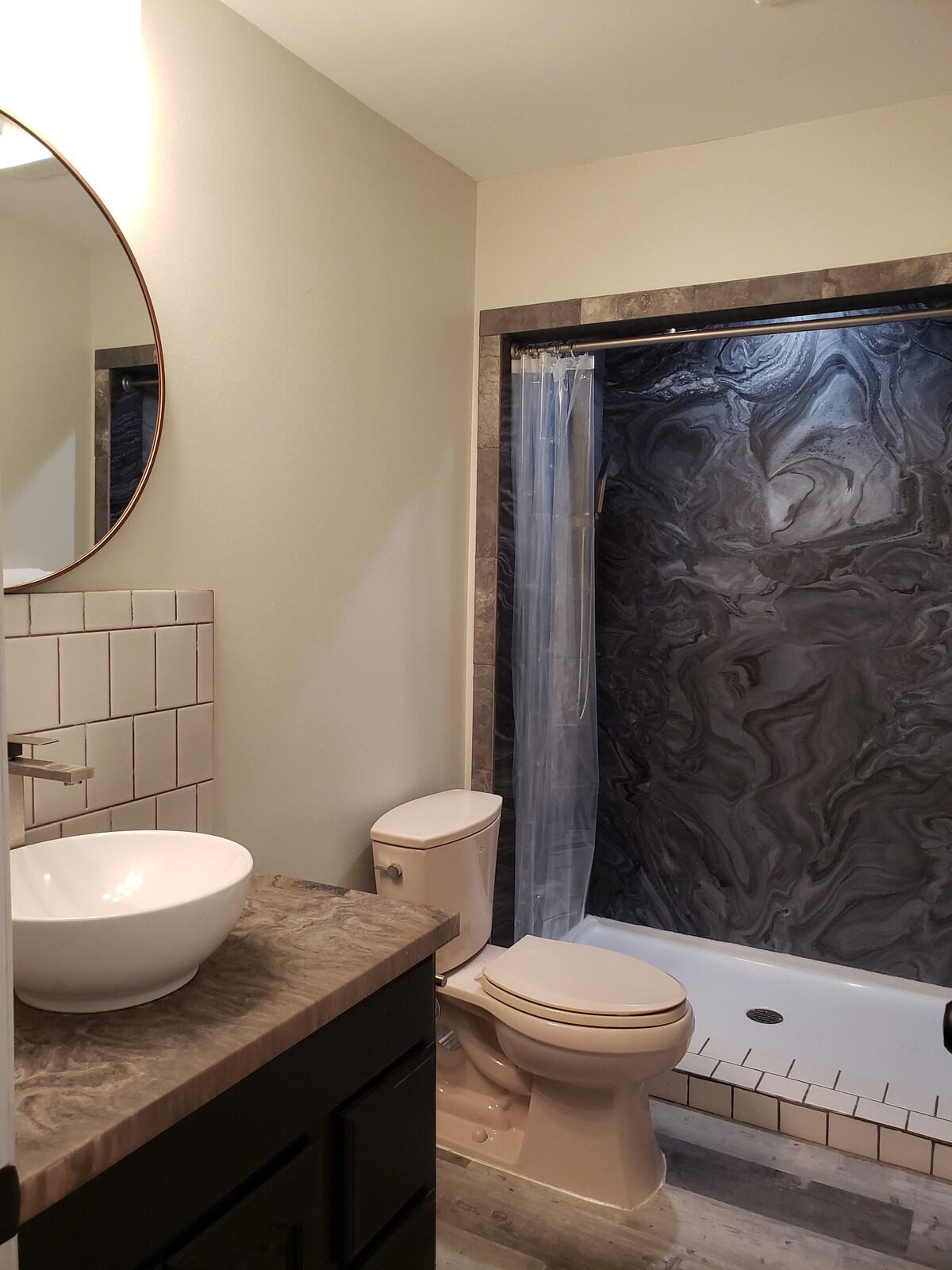 (Upstairs) Full bath, sink, shower/tub combo, toilet, mirror.