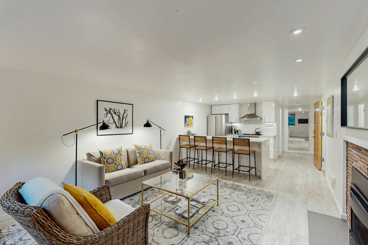 The space was designed as if we were going to live there. Every detail is thought through. Spacious, open layout in living area with fireplace, sofa, dining table, television, etc. Living area is open to kitchen which includes stainless appliances, gas range, microwave, refrigerator with ice/water through the door and more. Multiple storage spaces, including a double closet in the large bedroom. Washer and dryer for your convenience.