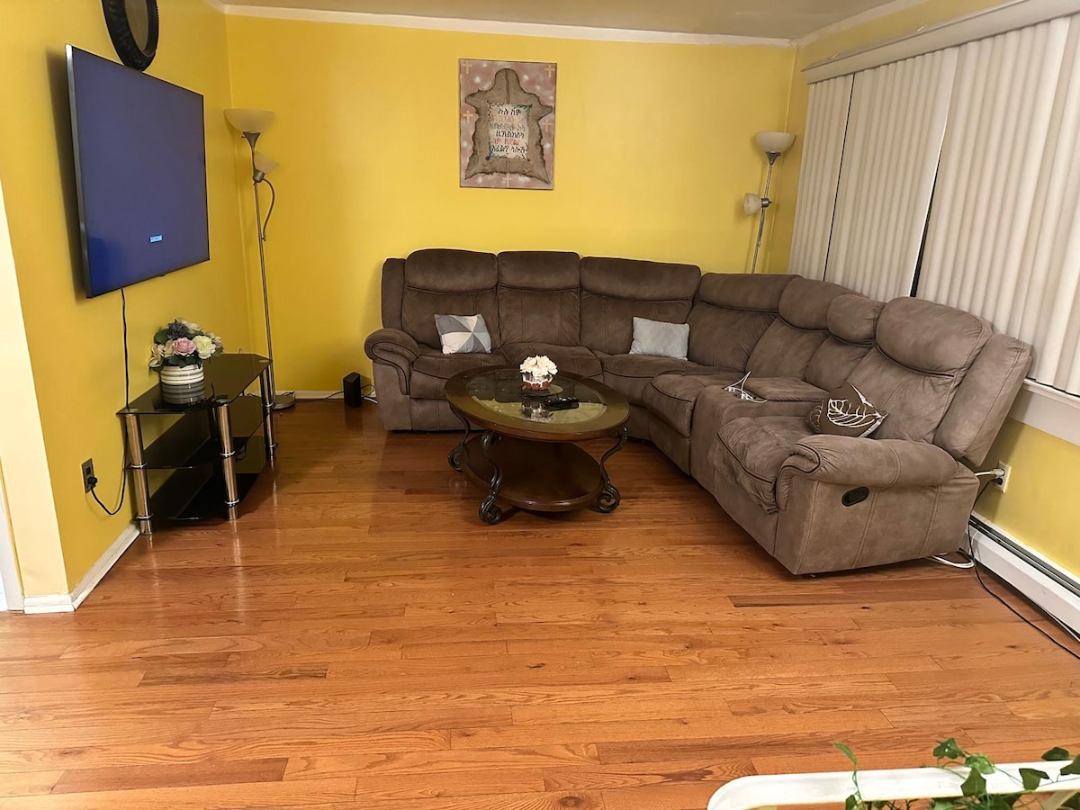 - Beautiful hardwood floor living room and dining room featuring big dining table that sits 8, and a piano for entertaining.