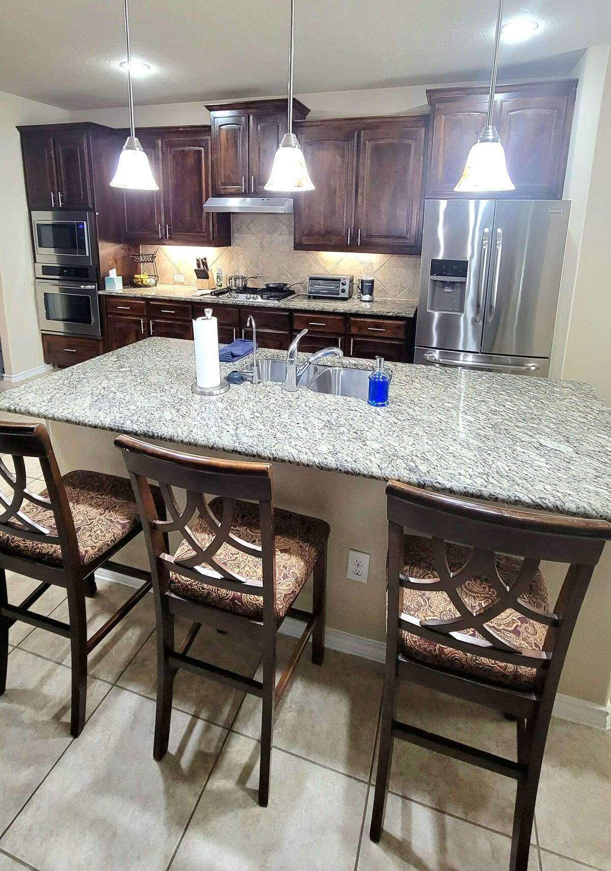 The full sized kitchen has a side by side fridge, double oven, a range, dishes, flatware, coffee maker (pods and/or a carafe), toaster, blender, etc. The laundry room has an oversized top-load washer and dryer. We have a charcoal Weber grill on the patio. The oversized garage can easily house two pick-up trucks. The private driveway is also long enough for 8 more vehicles. The home is in a very established neighborhood in Fort Worth with security cameras covering every inch of the exterior of the property. Your safety and security is our highest priority. We also have plenty of towels and sheets on site. The home is practically new and has it all!
