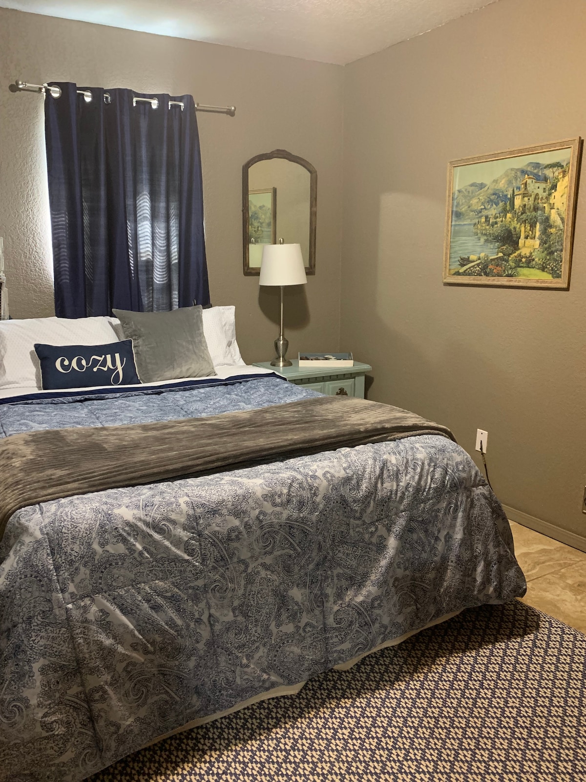 Forget your worries in this spacious and serene space. All the comforts of home are available for your use. Master bedroom has a king-size Serta perfect sleeper mattress, tile walk in shower, large closet, and sliding glass doors out to back patio. The two other nice sized and well-lit bedrooms each have day beds with trundles under them. Between the rooms is a large bathroom with a tub and shower. The kitchen and living room are spacious and practical. Then a nice yard to top it all off!