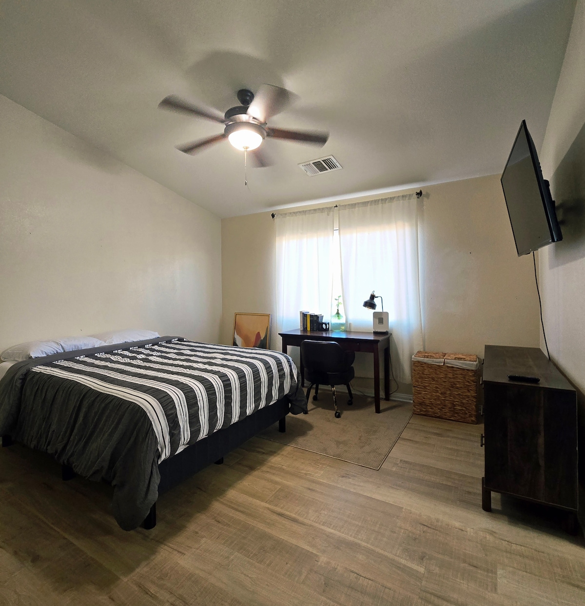 Welcome to your home-away-from-home! This private room offers a comfortable retreat in a quiet, well-maintained house. You'll have your own full bathroom, ensuring complete privacy and convenience. The room is equipped with a dedicated desk and chair, perfect for remote work or study.