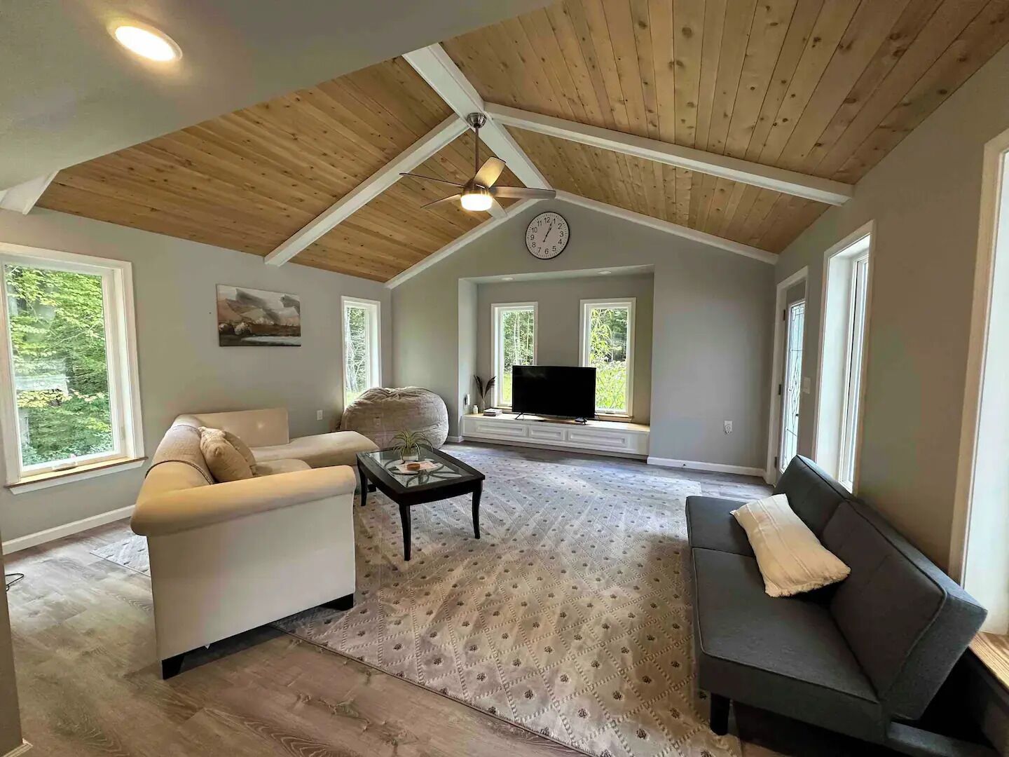 The open-concept main floor features a comfortable living room with a 65” smart TV and surround sound system, a fully equipped modern kitchen, and a dining area designed for gathering.