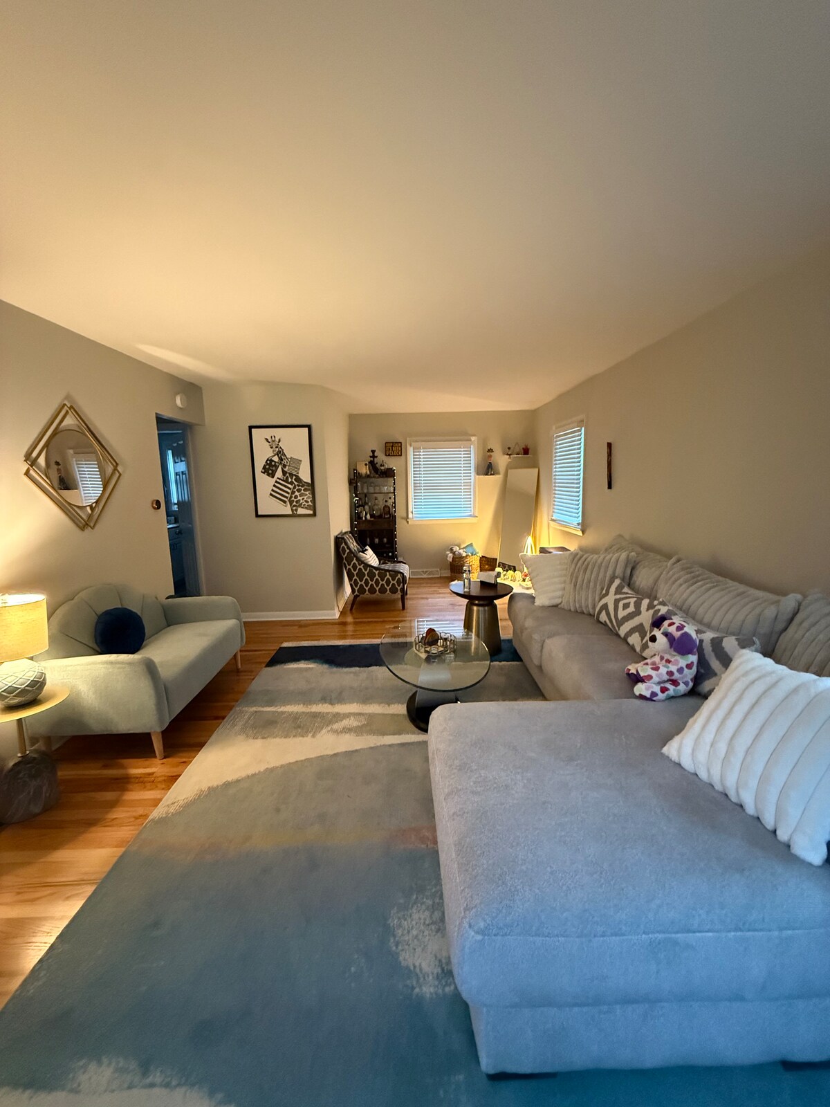 Large living room with AC, smart TV, basic cable and Wi-Fi provided.