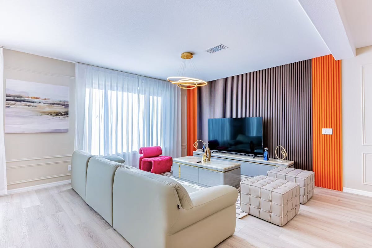 The living room has a 75" Smart TV; you can watch your favorite shows with all major streaming apps. WiFi is also available on site.