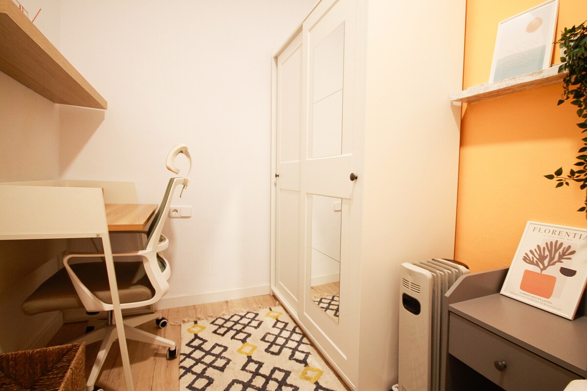 The room has a comfortable bed, drawers, a large closet with hangers, sheets, and a fan for summer. The flat also has 1.5 bathrooms, WIFI, TV, heating, and a kitchen equipped with everything.