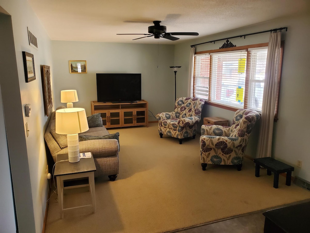 This remodeled two bedroom home with a TV bonus room has space for up to eight adults And three full baths. Lots of room to spread out! Downtown Excelsior Springs is within walking distance.