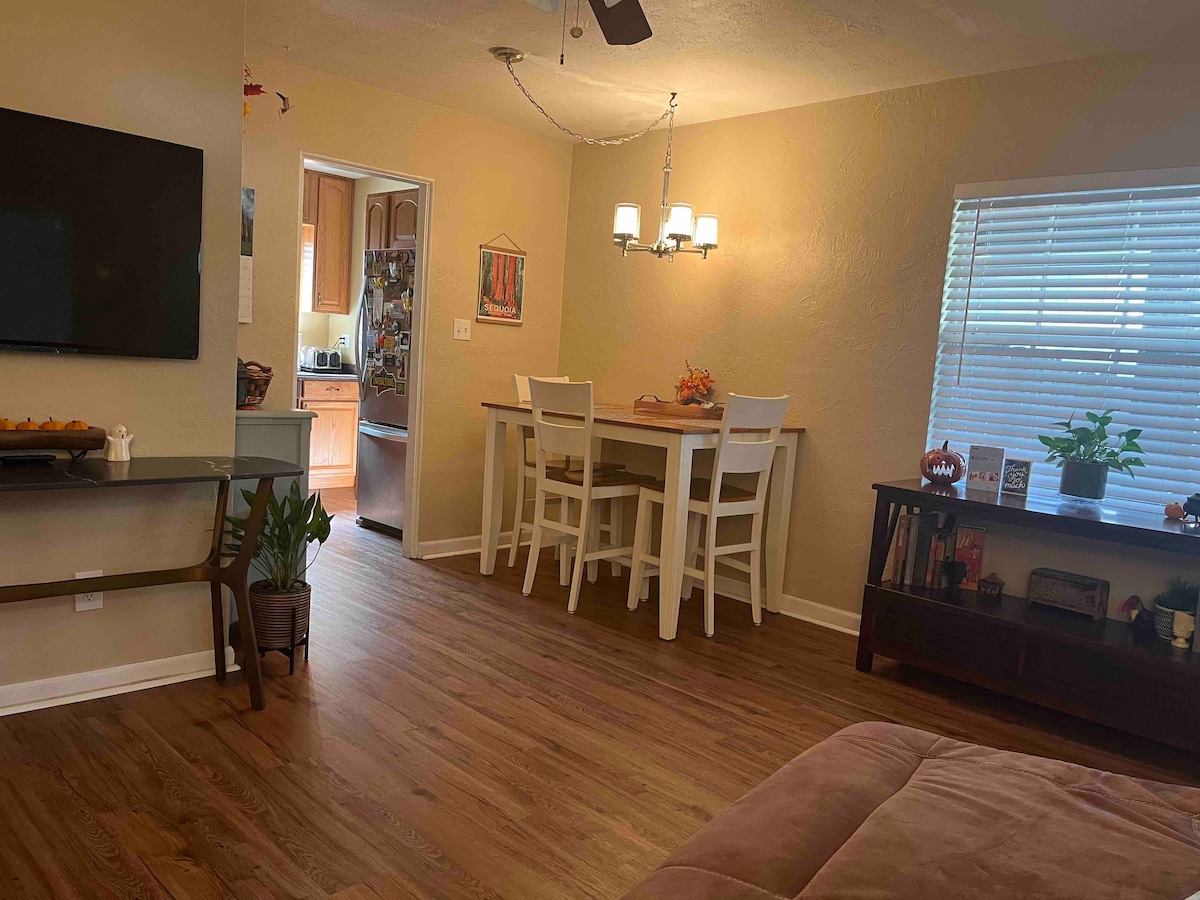 Your modern kitchen is fully stocked with basic cooking essential’s, a cozy living room with a smart tv, dining room with skylight.