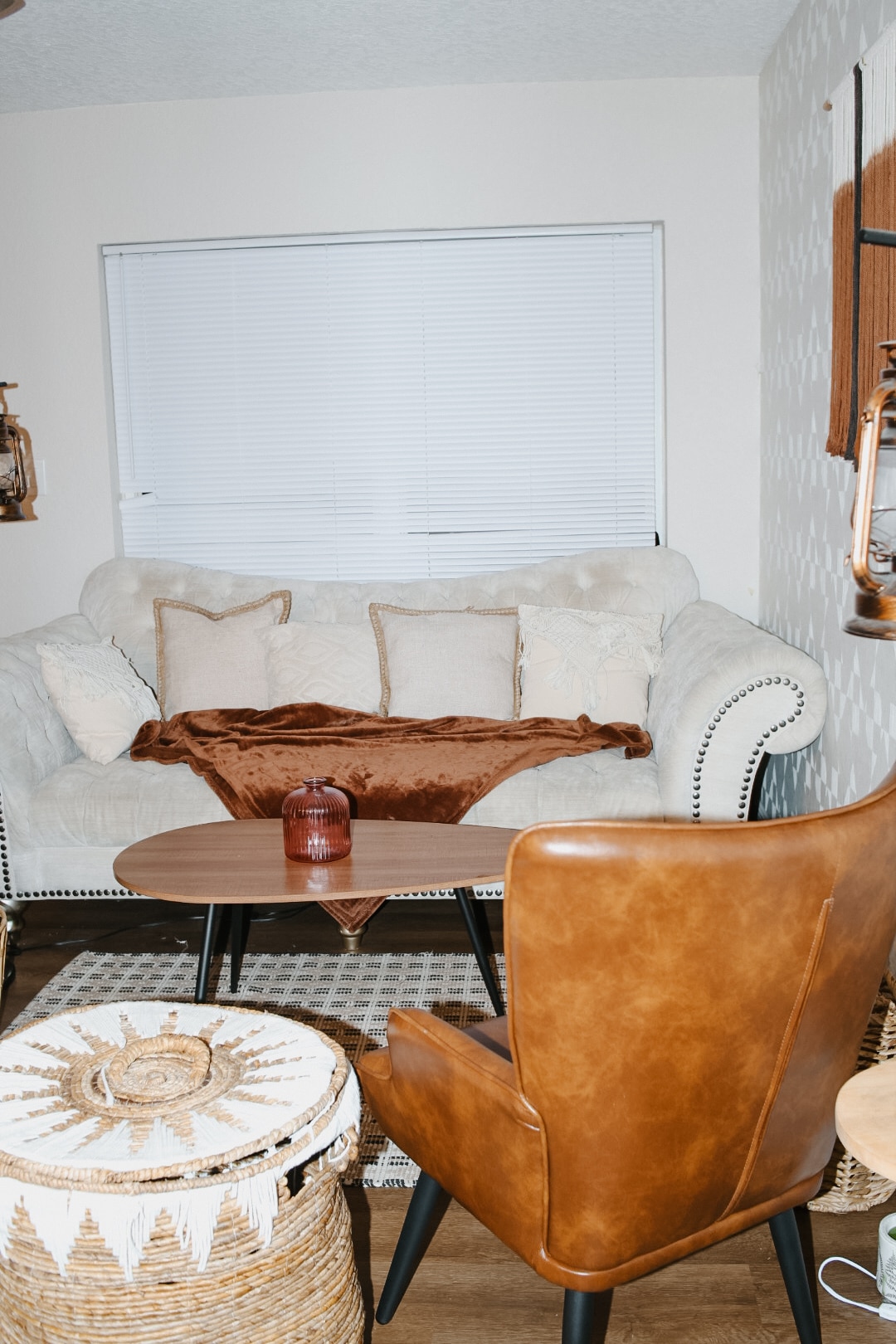 Sink into the plush deep-seated couch where you can warm up with the electric fireplace or turn off the heat setting to simply enjoy the ambiance. Catch up on your favorite shows and movies on the 65" Samsung smart TV.
